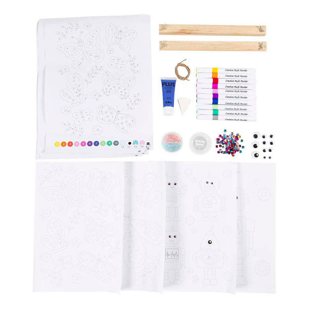 Gebruik de posterhangers die bij de set zijn geleverd om je kunstwerken in te lijsten. Schilder ze eerst en hang ze als ze klaar zijn in de kinderkamer: perfect voor een heel persoonlijke kunstgalerie!