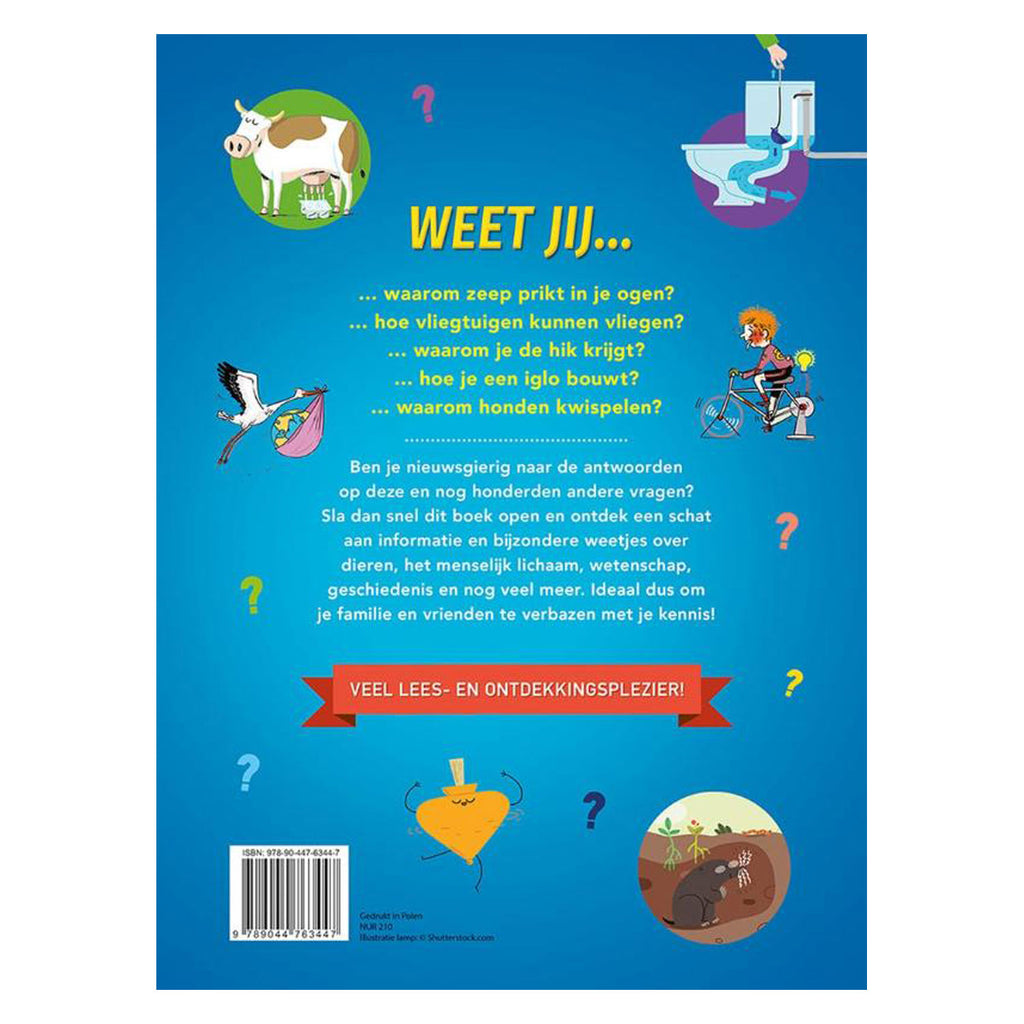 Dit grote vraag- en antwoordboek is ideaal voor nieuwsgierige kinderen, die willen te weten komen waarom zeep in je ogen prikt, hoe vliegtuigen kunnen vliegen en waarom je de hik krijgt. In dit boek kunnen ze de antwoorden op al hun vragen ontdekken dankzij de schat aan informatie en bijzondere weetjes over het hoe, wat en waarom van de dieren, het menselijk lichaam, wetenschap, geschiedenis en nog zo veel meer. Uren lees- en ontdekkingsplezier verzekerd!