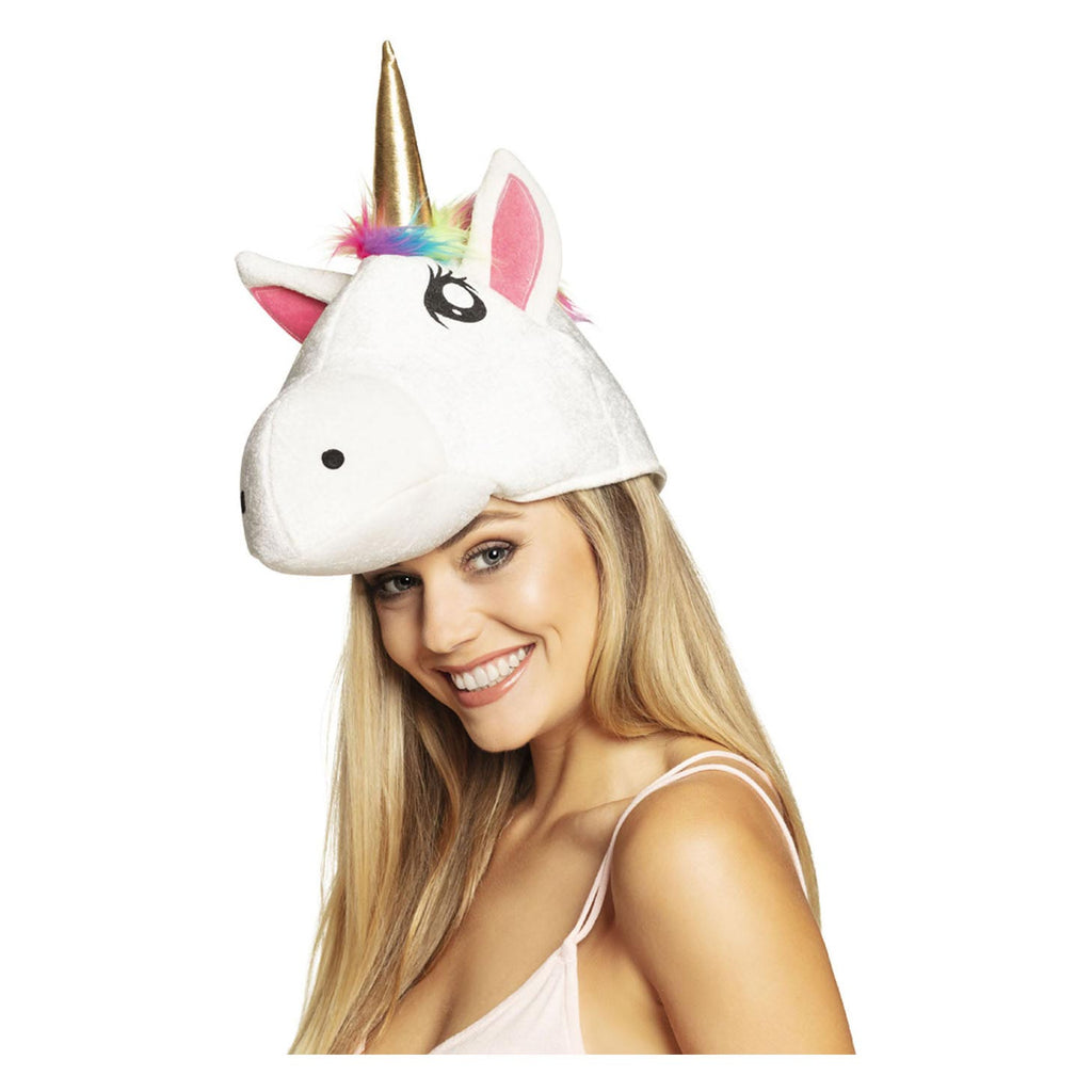 Hoed in de vorm van een eenhoornhoofd, met gouden hoorn en regenboogmanen. Maat 59. Gemaakt van 100% polyester.