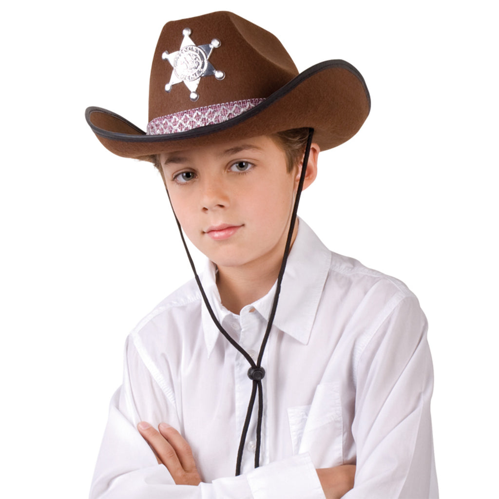 Bruine sheriff hoed met aantrekkoord. Voorop de hoed een sheriff-ster.
