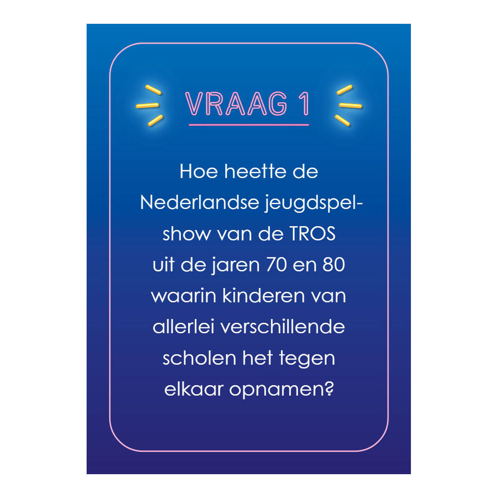 Vier je 60ste verjaardag met deze unieke quizdoos vol vragen over je jeugdjaren en keer terug naar onvergetelijke gebeurtenissen uit de geschiedenis en popcultuur. In welke film uit 1986 deden Tom Cruise en Val Kilmer uit de hoogte? En welke Amerikaanse president moest ook alweer aftreden vanwege het Watergate-schandaal? Stel je geheugen op de proef en dompel jezelf onder in een flinke dosis nostalgie. Doosje met 51 kaarten.