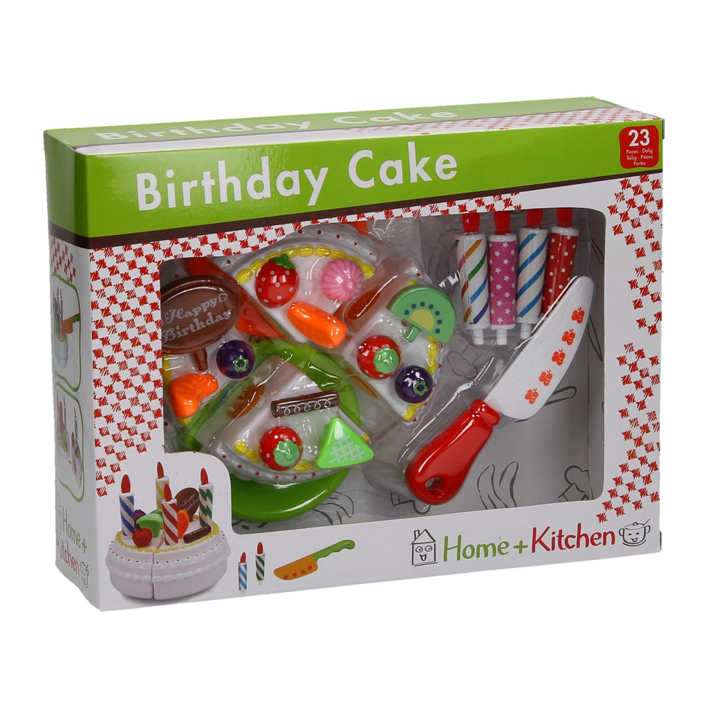 Deze 23 delige set bestaat uit verschillende toppings voor de taart, bordjes, kaarsjes, taartpunten en een mes.