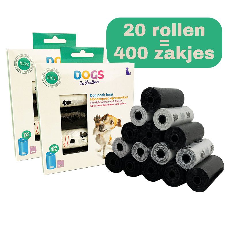 De rollen komen in twee kleuren: zwart en wit met hondenpootjes. Deze hondenzakjes zijn compact en zijn daarom geschikt voor de meeste dispensers. Daarnaast zijn de zakjes biologisch afbreekbaar en erg duurzaam. Deze hondenpoepzakjes zijn sterk zodat ze niet scheuren of oprekken. Je ontvangt 20 rollen met 20 zakjes.
