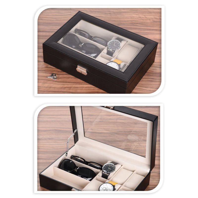 Aflsluitbaar horloge- en brillenkistje voor het stofvrij opbergen van 6 horloges en 3 (zonne)brillen.