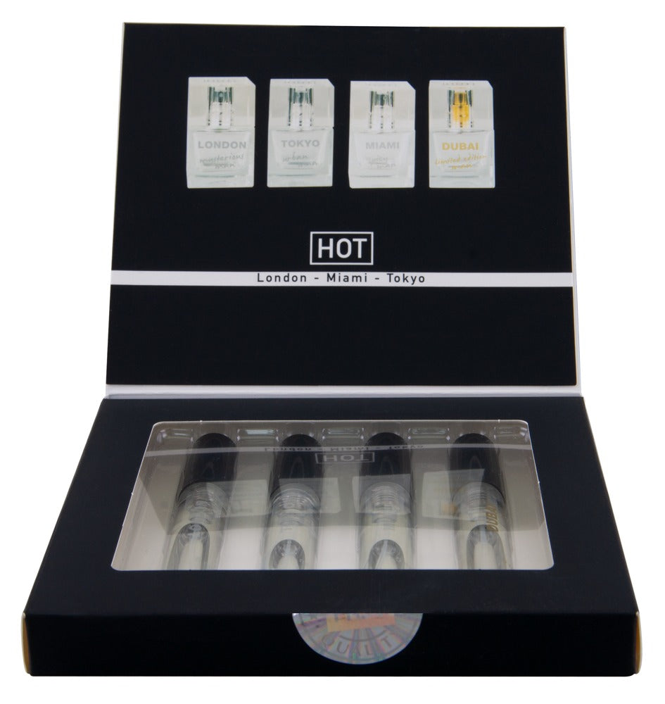 The Pheromone Perfume Tester Box LMTD men by HOT presents 4 selected urban fragrances in a set that immerse men in the spirit of the cities of London, Miami, Tokyo and Dubai. Each of the fragrances is enriched with pheromones to emphasise and accentuate male attractiveness. For an irresistibly attractive aura!