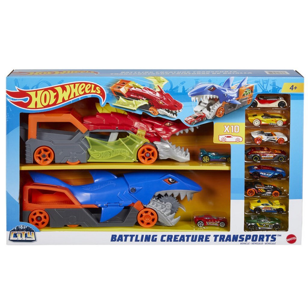 Hot Wheels Themas Hauler Bundle. Inhoud: TweeHot Wheelstrucks in haai- en draak-vorm, en 10 Hot Wheels racewagens. Geschikt voor kinderen vanaf 4 jaar.