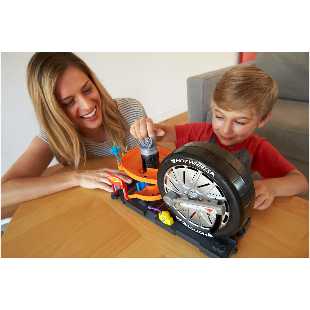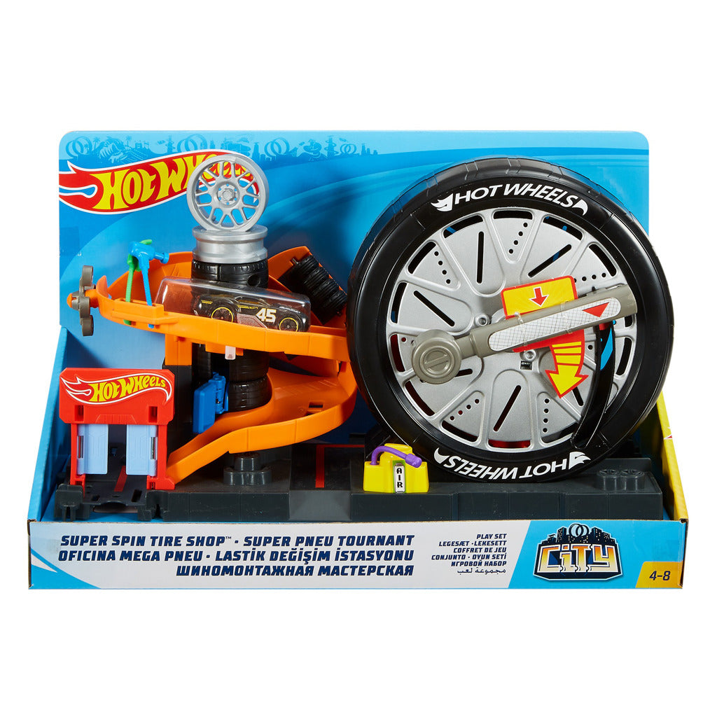 In deze Hot Wheels City bandenshop kun je je auto laten repareren na je avonturen in Hot Wheels City. Rij over de spiraalbaan omhoog en kies nieuwe banden en velgen. Rij na een snelle servicebeurt het mega-wiel in en... draaien maar! Je auto maakt een looping in de band en racet met gierende banden via de andere kant naar buiten: klaar voor nieuwe avonturen in Hot Wheels City. Deze sets worden geleverd met een nieuw aansluitsysteem en kunnen aan andere Hot Wheels City sets worden bevestigd, maar zijn nog altijd geschikt voor gebruik met je oranje baan. Inclusief één Hot Wheels voertuig. Geschikt voor kinderen van4 tot8 jaar.