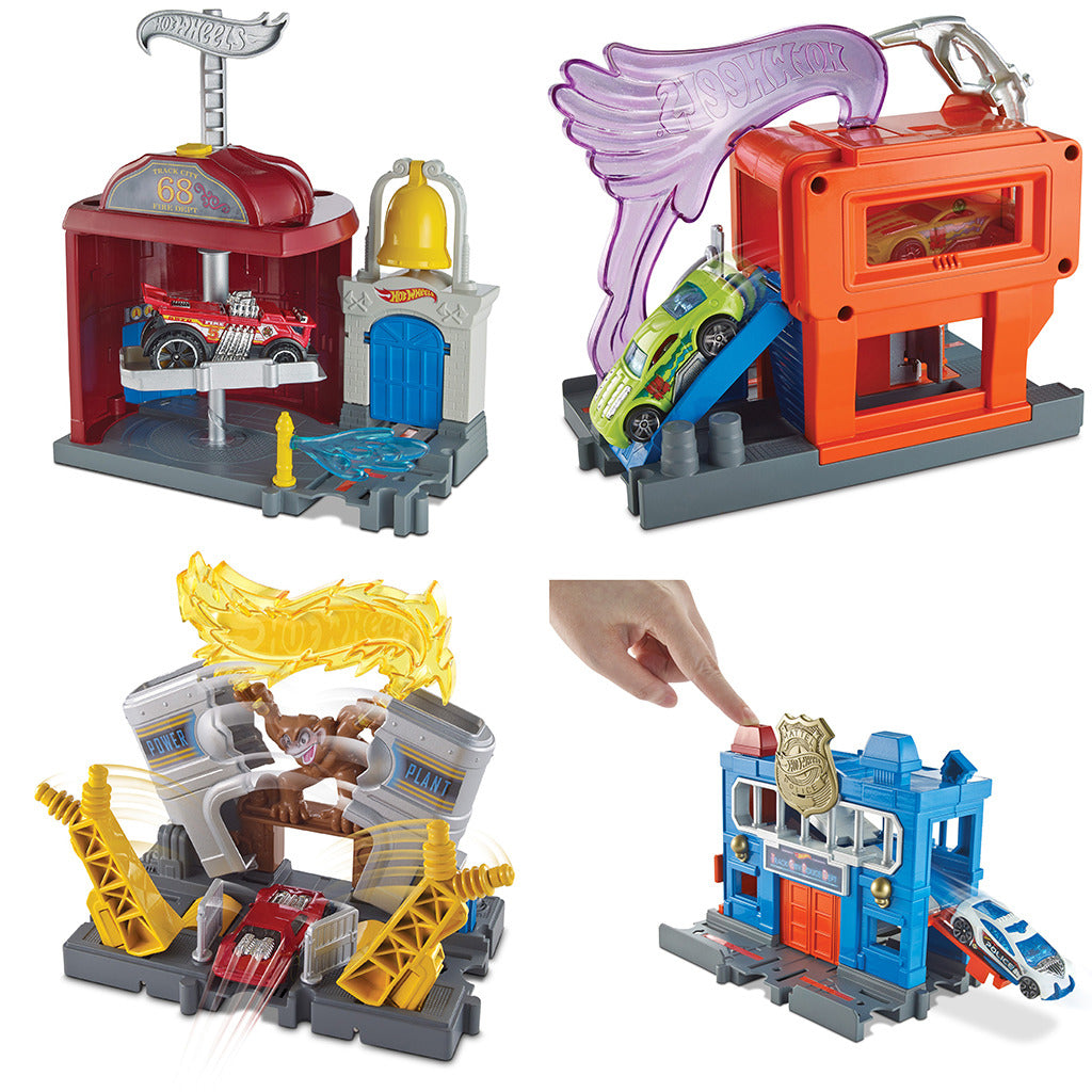 Neem je Hot Wheels auto's mee naar Hot Wheels City en ontdek al je favoriete plekken in de stad. Sluit de boeven op in het politiebureau, glij via de brandweerpaal in de Brandweerkazerne omlaag, ga naar het pompstation en vul je tank met benzine, vang het ondeugende aapje bij de elektriciteitscentrale en blijf uit de buurt van de piranha's in het aquarium. Deze sets worden geleverd met een nieuw aansluitsysteem en kunnen aan andere Hot Wheels City sets worden bevestigd, maar zijn nog altijd geschikt voor gebruik met je oranje baan. Inclusief één Hot Wheels® auto. Geschikt voor kindeen van3 tot6 jaar. Dit artikel is beschikbaar in verschillende uitvoeringen.U kunt niet kiezen, maar ontvangt een willekeurige uitvoering.