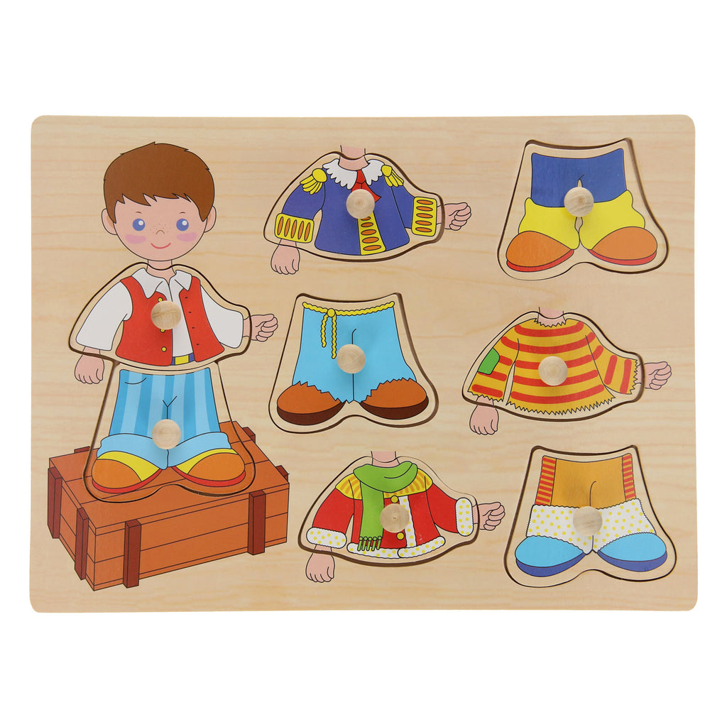 Geef de jongen telkens een andere outfit! De Houten Aankleednoppenpuzzel Jongen heeft een afbeelding van een jongen die je kunt voorzien van 8 puzzelstukjes: 4 bovenstukjes en 4 onderstukjes.