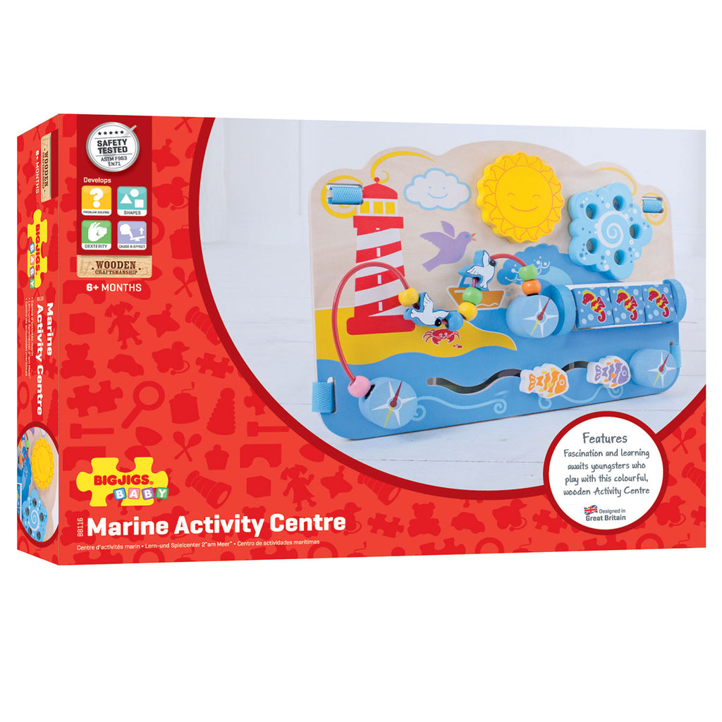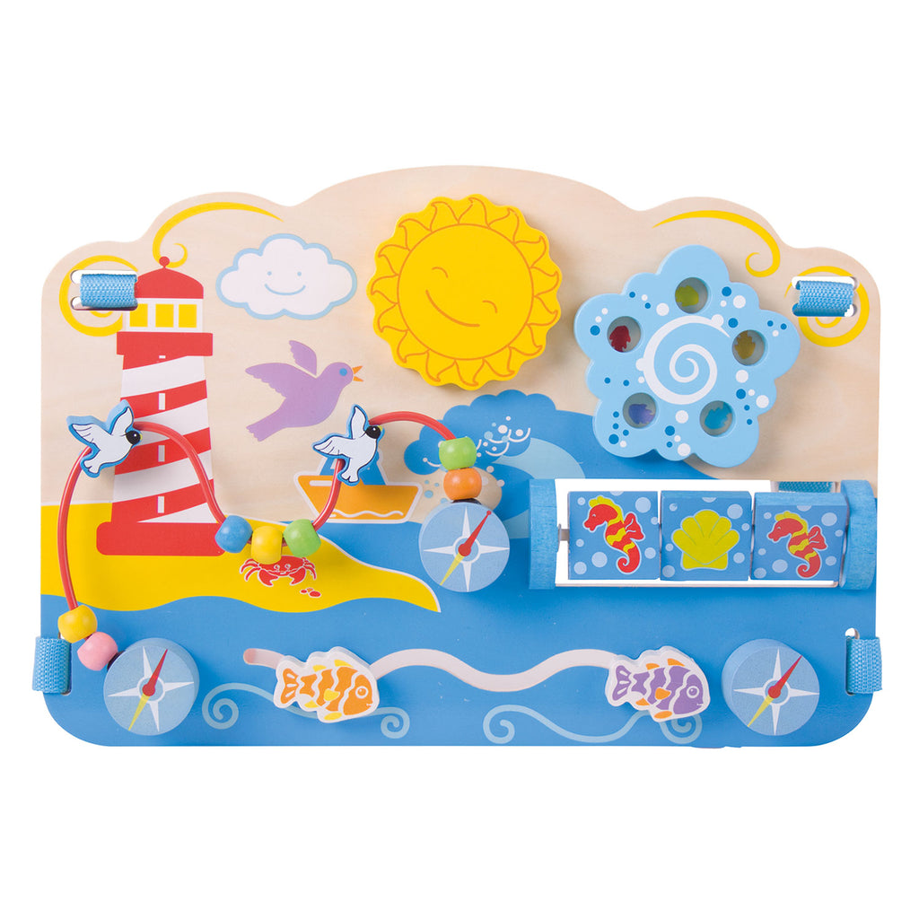 Speel, ontdek en leer met dit mooie houten zee activiteitenbord. Op dit vrolijke bord is van alles te ontdekken, te verschuiven en aan te raken. Draai aan de zon of aan de blauwe bloem. Draai de drie blokjes om en probeer drie zeepaardjes of 3 schelpjes naast elkaar te krijgen. Laat de visjes heen en weer zwemmen en beweeg de kralen en zeemeeuwen over de draad. Er valt genoeg te ontdekken en te leren met dit mooie vrolijke bord! Inclusief riemen om dit bord vast te maken aan je bedje of box.