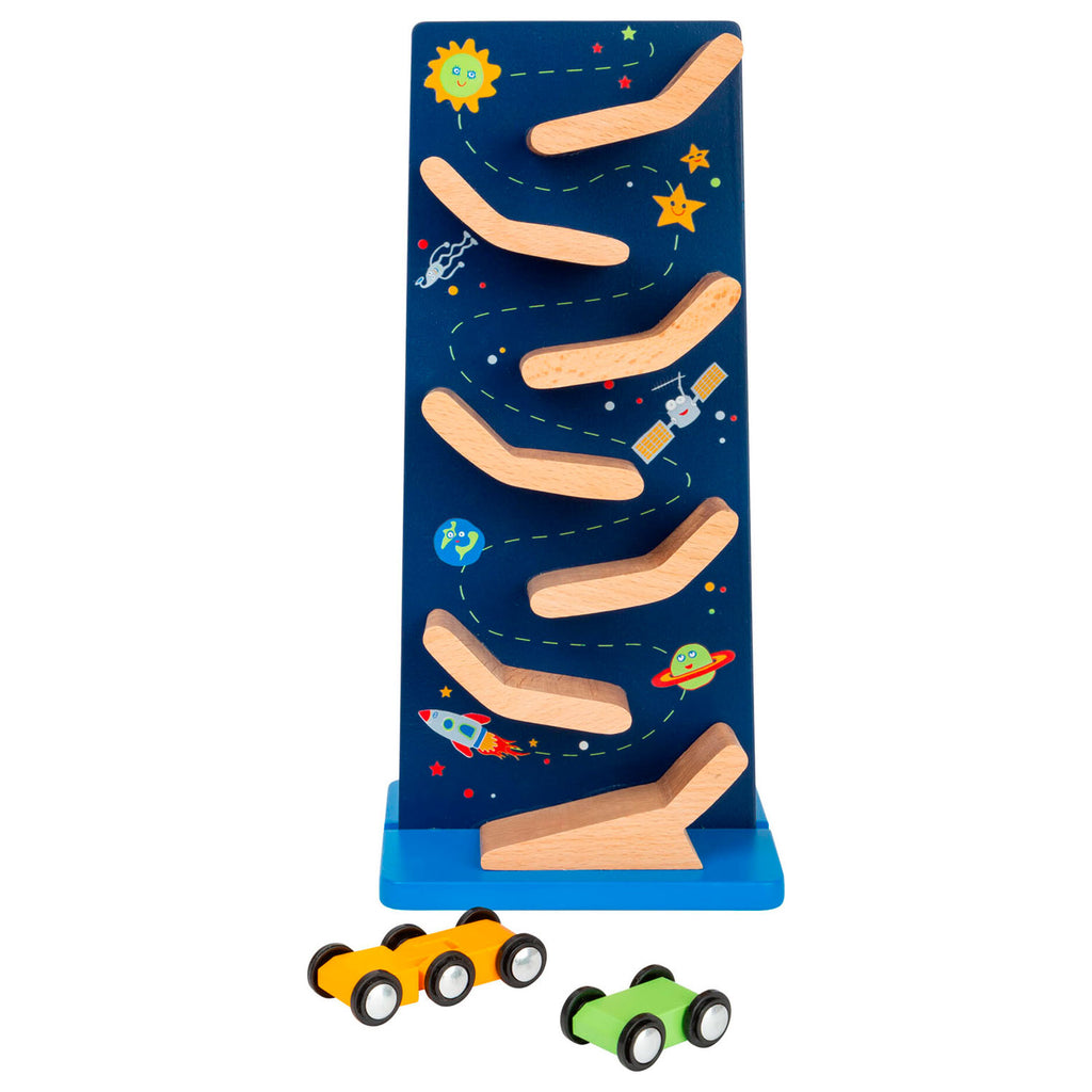 Met de snelheid van het licht door de baan! Deze houten trappeltoren in een universum look biedt jonge astronautjes speelplezier op volle snelheid wanneer de twee space shuttles hun weg naar beneden rammelen en onderweg salto's maken. Deze trapsgewijze toren zal jonge ruimtevaarders fascineren, en zorgt voor galactisch plezier in de kinderkamer. Welk ruimteveer wordt als volgende op een adembenemende ruimtemissie gestuurd?