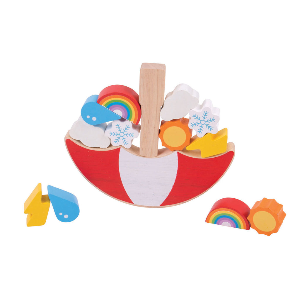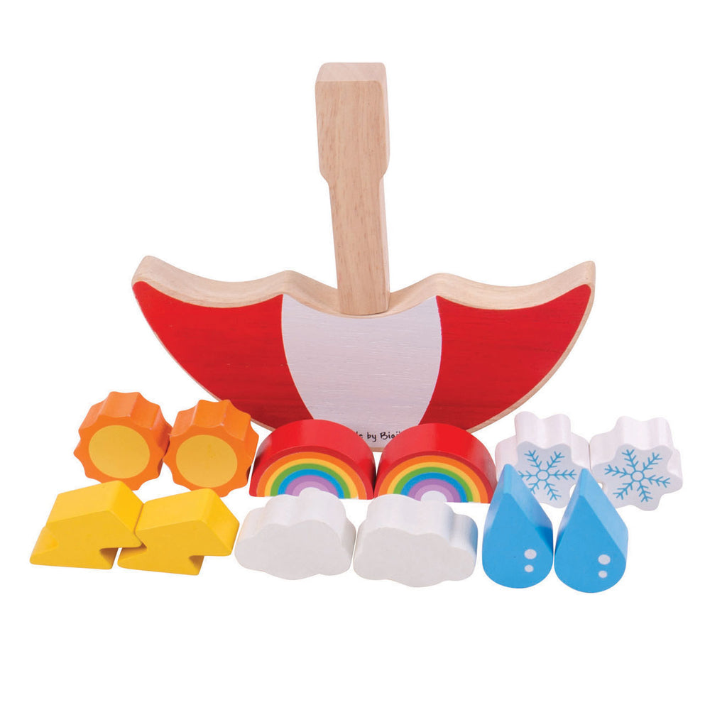 Wat ziet het er vrolijk uit, dit Houten Balansspel Weer! Plaats de grote rood met wit gestreepte paraplu ondersteboven en probeer hier de zonnetjes, wolkjes, regendruppels, regenboogjes, sneeuwvlokjes en bliksemflitsen bovenop te plaatsen. Lukt het jou en je vrienden om ze allemaal te plaatsen, zonder dat ze vallen in dit Houten Balansspel Weer?