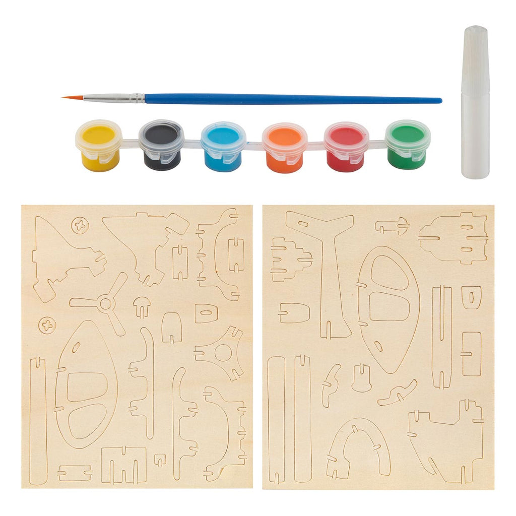 Bouw- en schilderpakket voor het maken van je eigen houten helikopter. Zet de onderdelen in elkaar en beschilder hem naar eigen wens. Dit bouwpakket bevat 6 verfpotjes en een kwastje. Gemaakt van hout en geschikt vanaf 5 jaar.