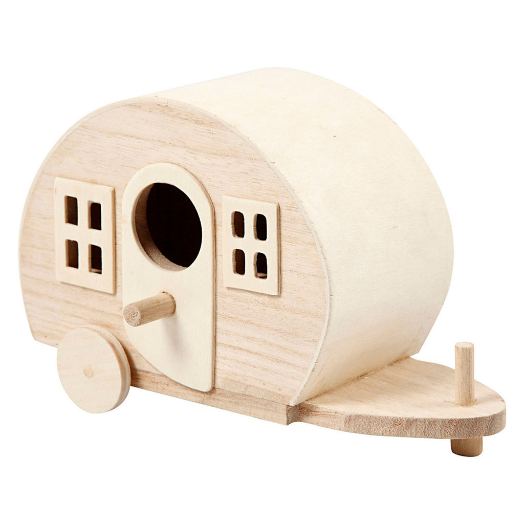 Caravan van licht hout met fijne details om te decoreren. De caravan is 18 x 8 x 11 cm en wordt compleet gemonteerd geleverd. De caravan heeft een grote opening in het deurtje en stokje voor de vogels om op te zitten, zo kun je er ook een vogelhuisje van maken!