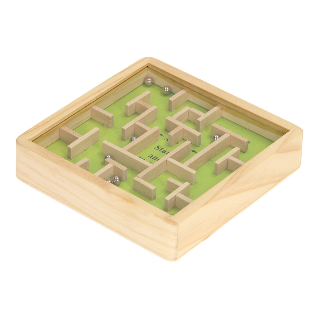 Oefen je stabiliteit met dit houten doolhof. Beweeg het spel voorzichtig heen en weer en probeer de balletjes naar de uitgang te leiden.