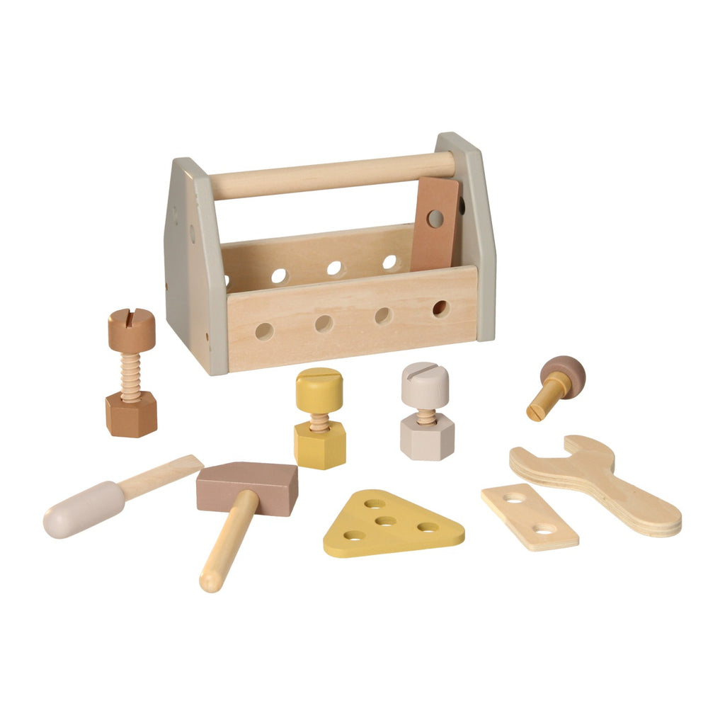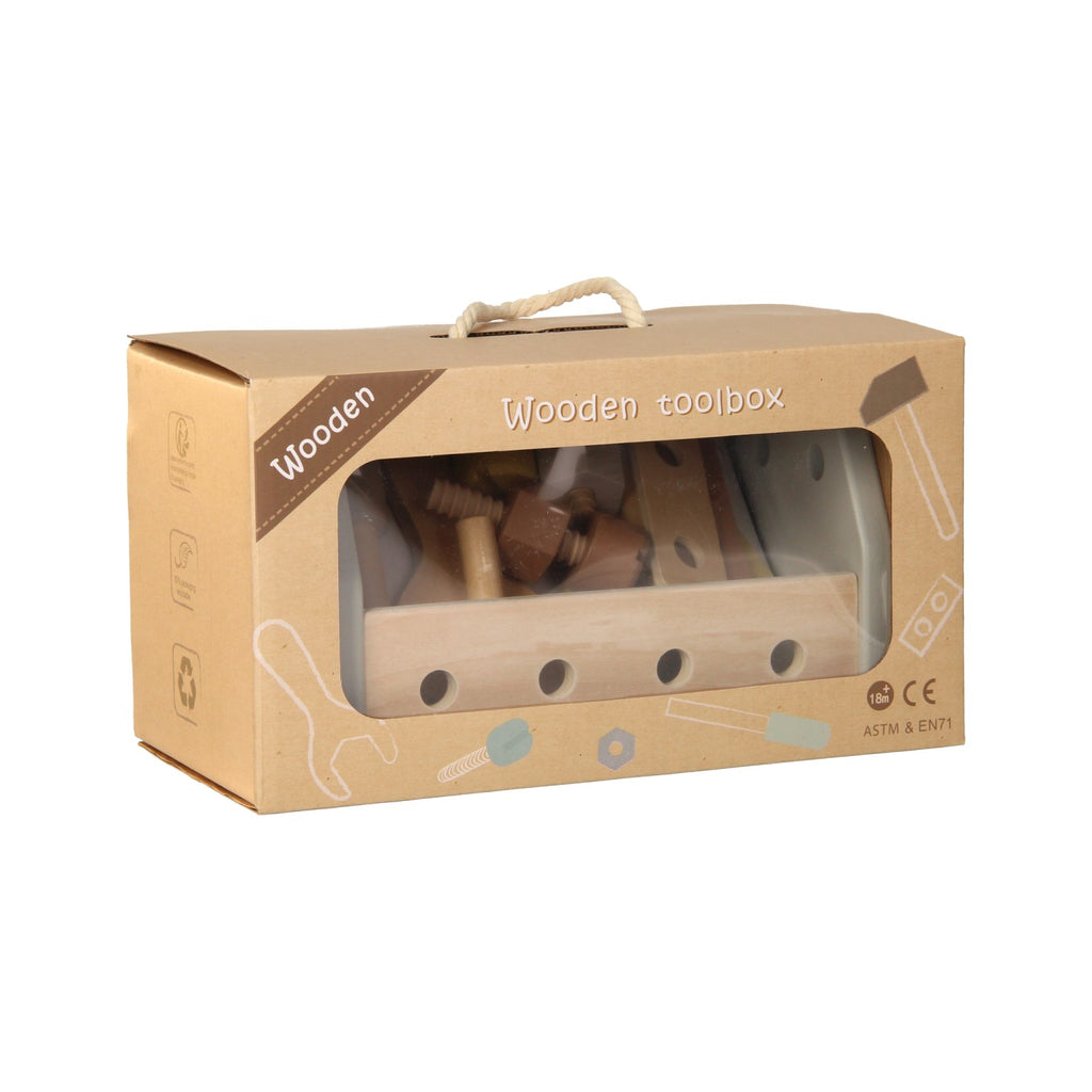 Houten gereedschapskist met gele accenten, inclusief gereedschap.