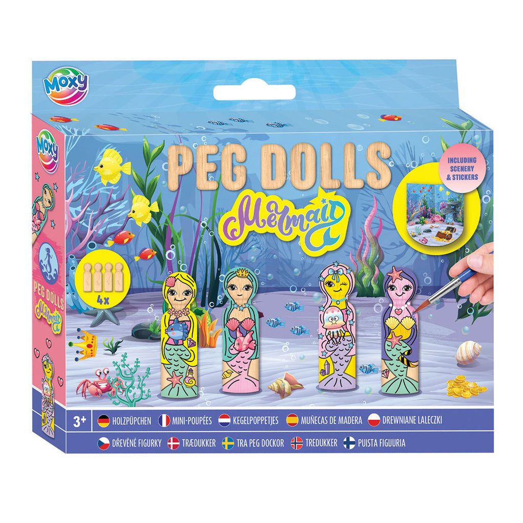 Knutselset voor het maken van 4 houten pegdolls in zeemeerminnenthema. Inclusief pegdolls, verf, kwatjes, speelachtergrond en stickers. Geschikt vanaf 3 jaar.