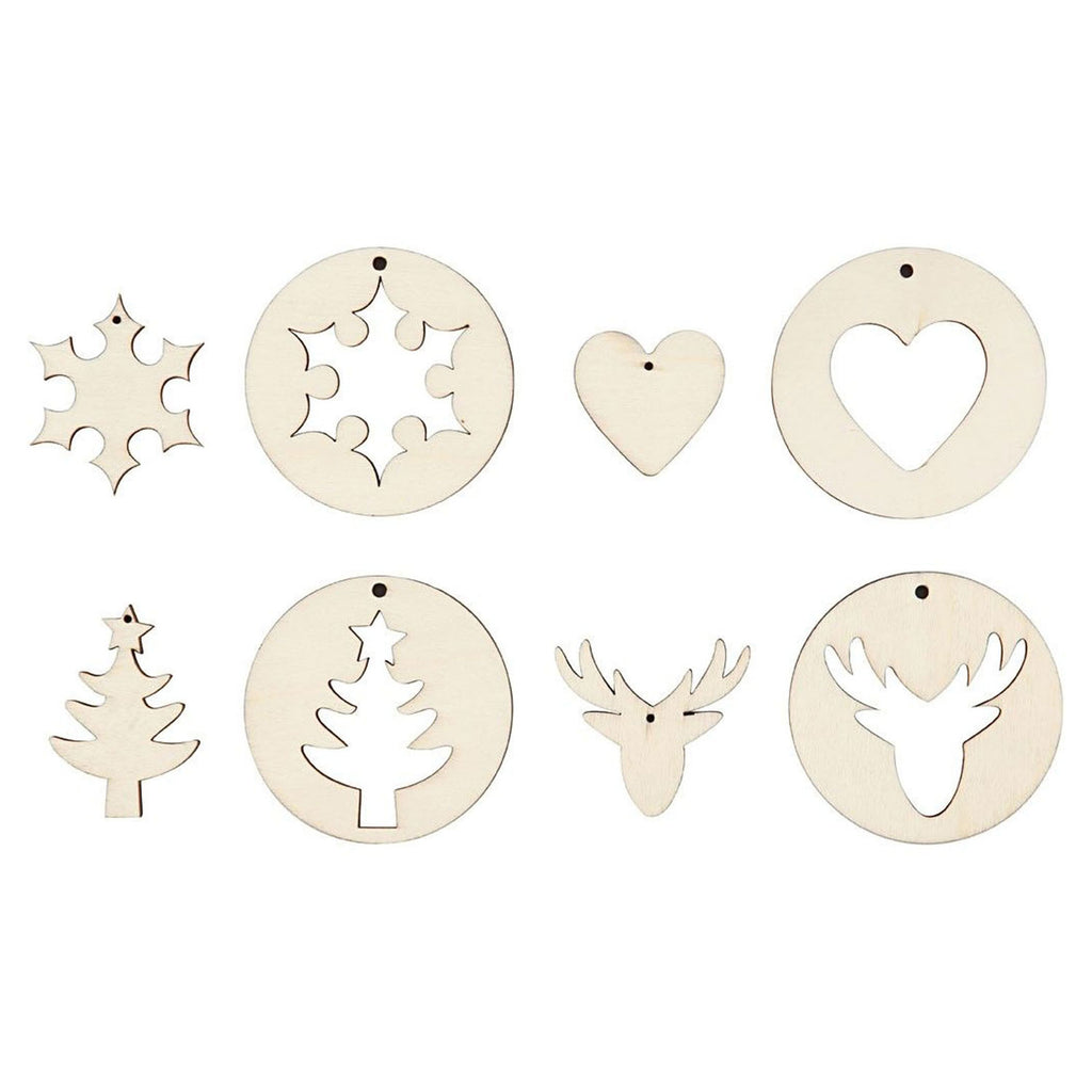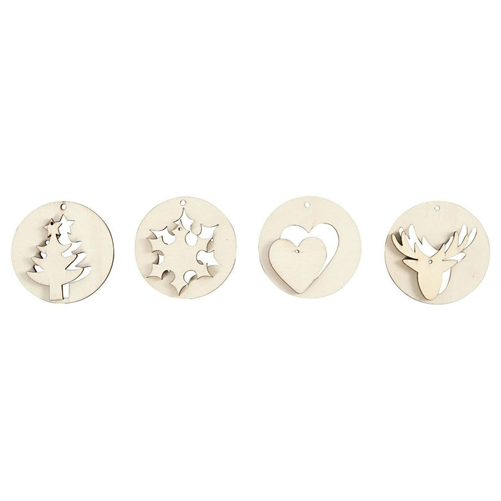 Set 2-in-1 decoraties in 4 verschillende designs. Elk een ronde schijf van licht hout van 4 mm dikte met een los binnenstuk in een kerstthema. Allen met donkere randen en een oog om op te hangen. Inhoud: 2-delig in 4 designs. Dikte 4 mm.