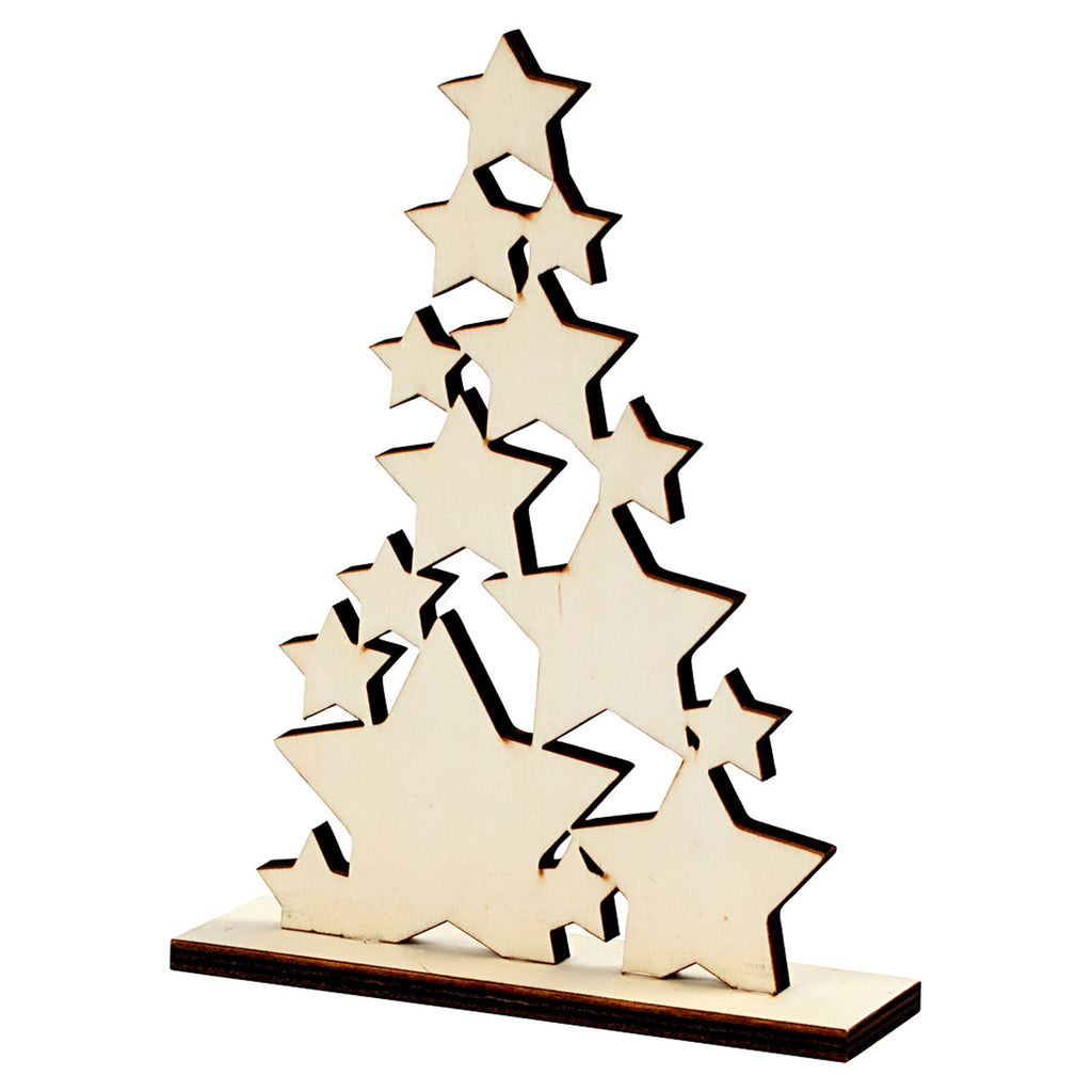 Houten kerstboom in de vorm van sterren. De boom heeft een hoogte ca. 19 cm, is 14,7 cm breed en 4 cm.