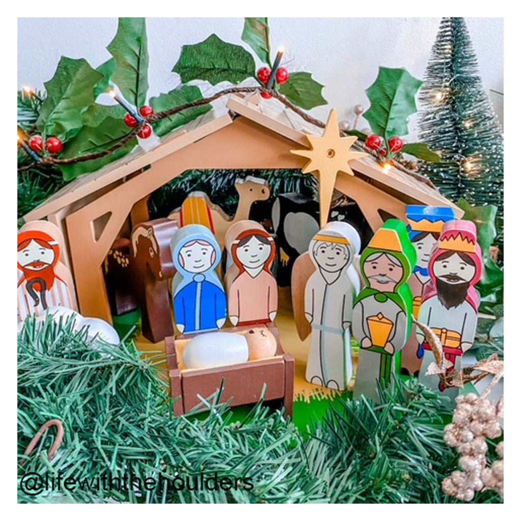 Deze houten kerststal heeft een volledige collectie felgekleurde houten figuren. Er is natuurlijk het kindje Jezus, plus Maria en Jozef, de drie wijze mannen, drie herders, engel Gabriël, een schaap, een ezel, een koe, een paard en een kameel.