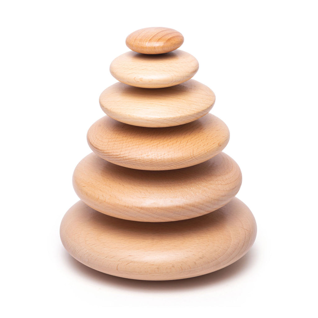 Stapel de gladde houten kiezelstenen voorzichtig op elkaar en zoek naar de balans voordat ze naar beneden vallen. Een eenvoudig maar leuk houten stapelspel, de speelmogelijkheden zijn eindeloos.