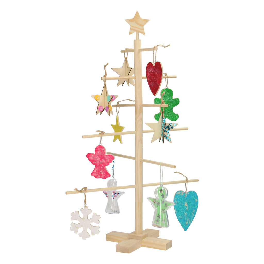 Geometrische zelf in elkaar te zetten kerstboom. Geleverd in losse delen. Bestaat uit een kruisvoet (18cm) en ronde stokken met gaten in 6 lengtes en een ster voor in de top.