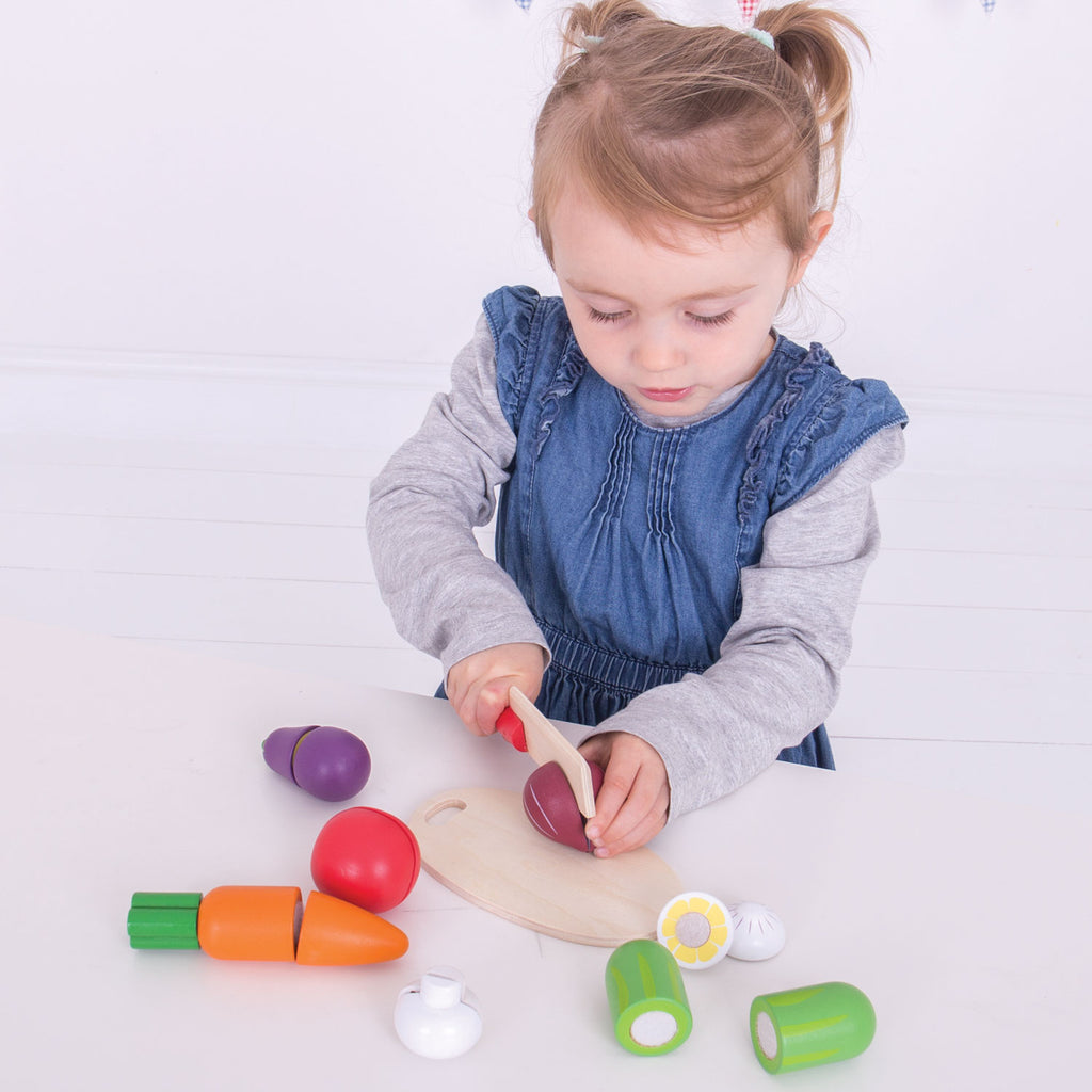 Kook een heerlijk diner met de verse groenten uit de tuin met dit houten kistje met snijgroenten. Snijd de wortel, aubergine, tomaat, komkommer, uien en knoflook op het klittenband doormidden en maak een heerlijke ratatouille! Met behulp van het houten mes en snijplank ben je net een echte chef! Spelen met de snijgroenten stimuleert de ontwikkeling van fantasie en sociale vaardigheden.