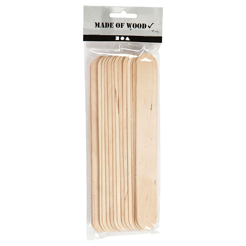 Maak de mooiste creaties met deze set van 15 lange, brede houten knutselstokjes. Wist je dat je hele leuke dingen kunt knutselen met deze ijsstokjes? Maak bijvoorbeeld een schildpad. Het enige wat je nodig hebt is verf, een stift en een bolletje wol. Niets is te gek! Afmeting: 20 bij 25 millimeter. Exclusief accessoires.