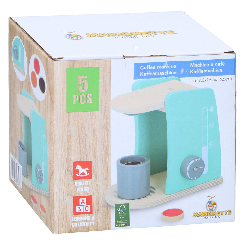 Houten koffiezetapparaat met houten kopje en drie verschillende koffievullingen. De speelkoffiemachine heeft een formaat van 160 x 93 x 164 mm en weegt ongeveer 825 gram. Alle onderdelen zijn gemaakt van kwalitatief hout.