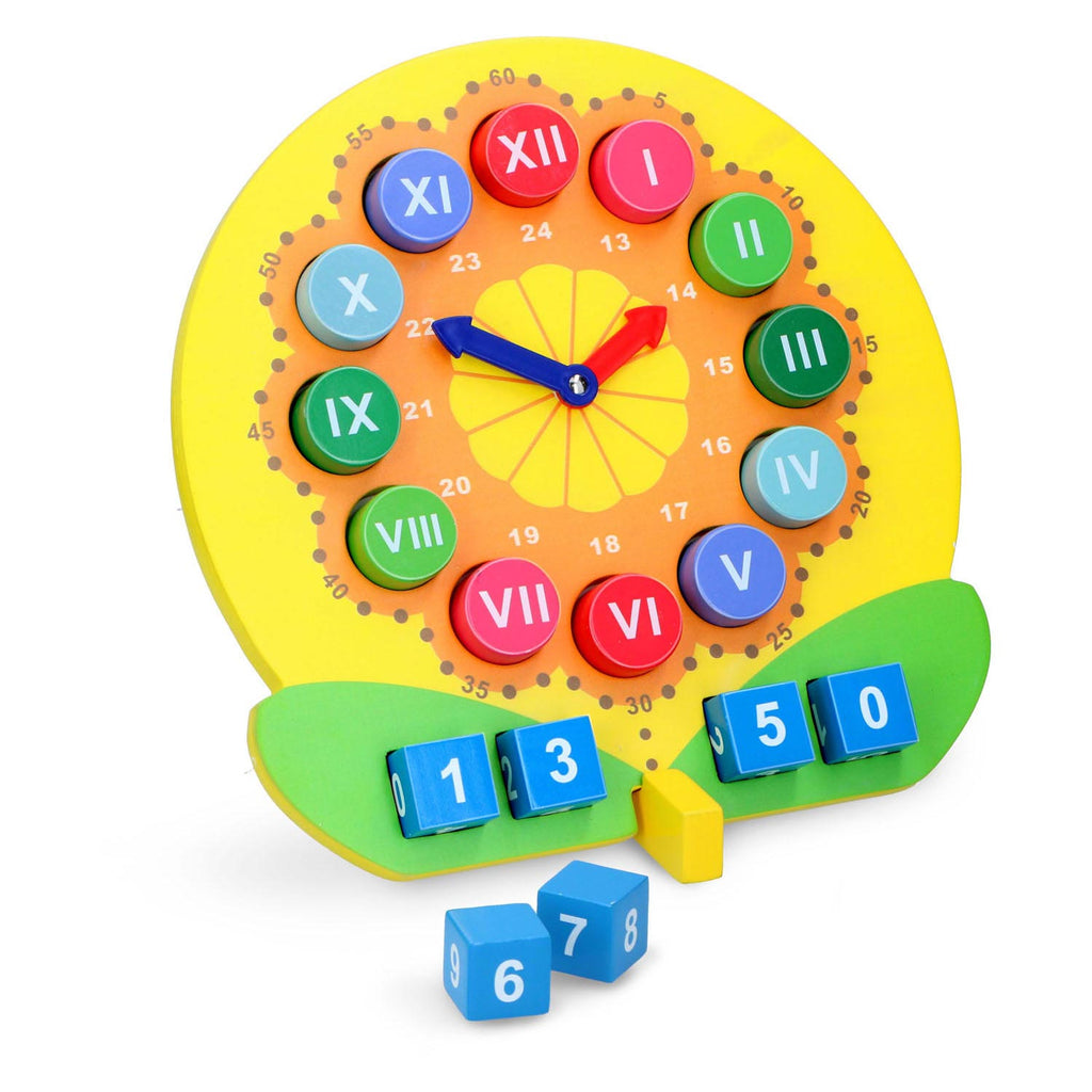 Houten leerklok met analoge en digitale klok, met uitneembare blokken. De klok heeft een formaat van 15 x 295 x 295 mm en weegt ongeveer 1250 gram. Alle onderdelen zijn gemaakt van kwalitatief hout.