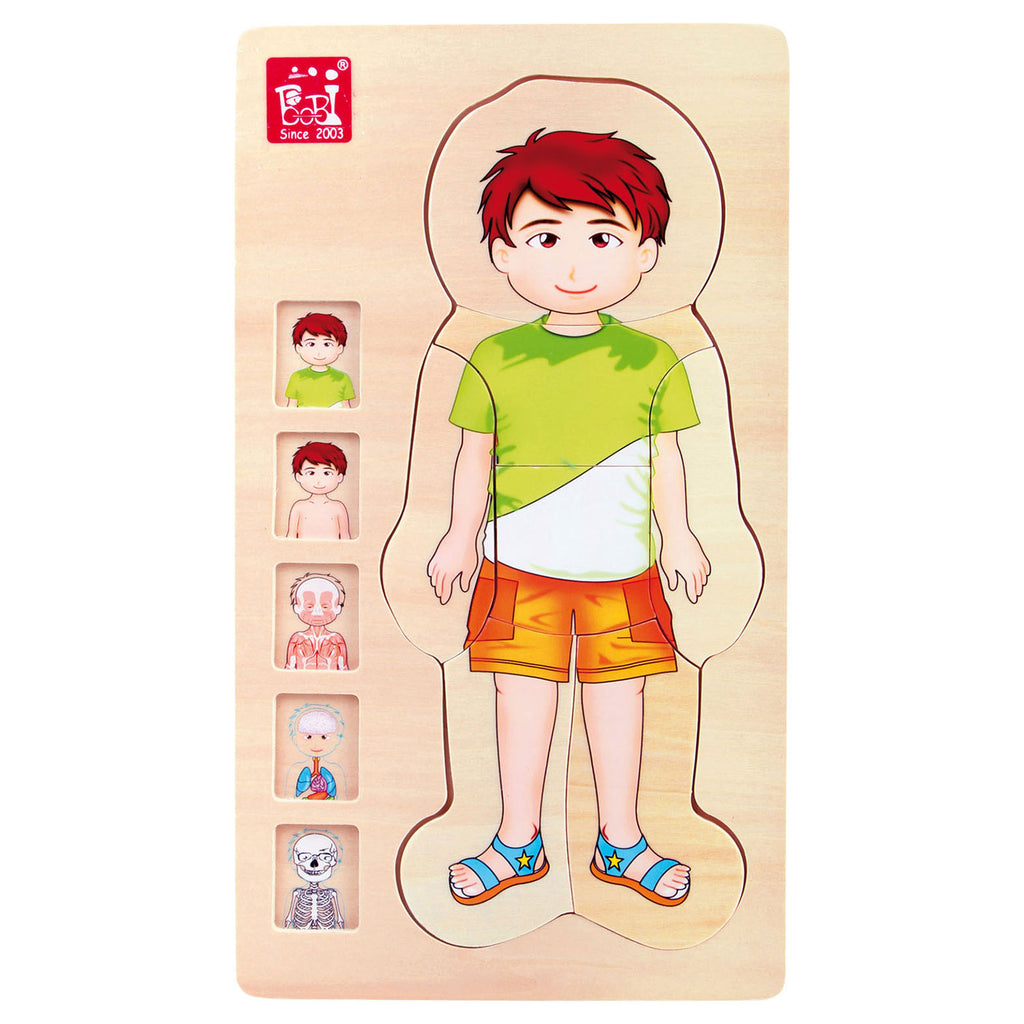 Maak het lichaam van een jongen na met deze houten puzzel. Plaats de 29 stukjes op de 4 verschillende borden en ontdek hoe het skelet, de organen en de spieren van de jongen er uit zien. Spelen met de puzzel stimuleert motorische vaardigheden en geeft inzicht in het menselijk lichaam.