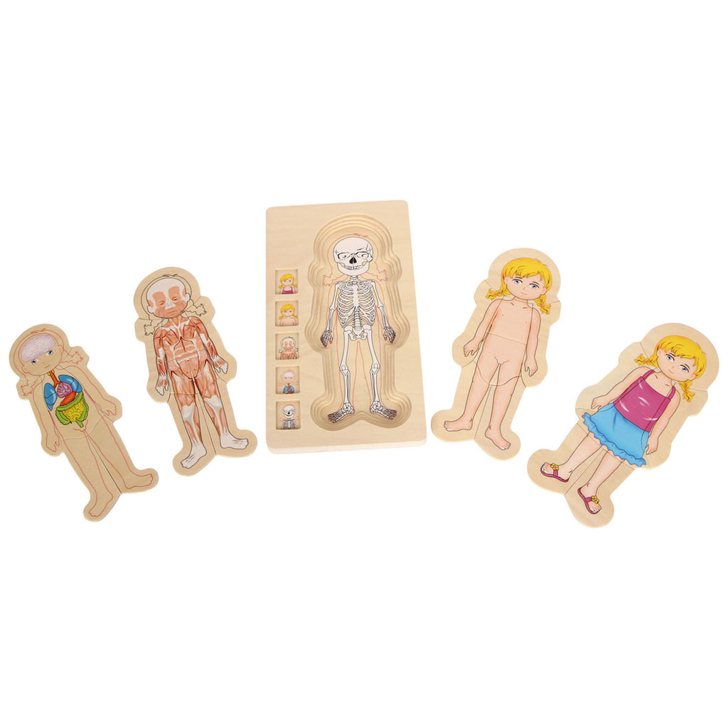 Maak het lichaam van een meisje na met deze houten puzzel. Plaats de 29 stukjes op de 4 verschillende borden en ontdek hoe het skelet, de organen en de spieren van het meisje er uit zien. Spelen met de puzzel stimuleert motorische vaardigheden en geeft inzicht in het menselijk lichaam.