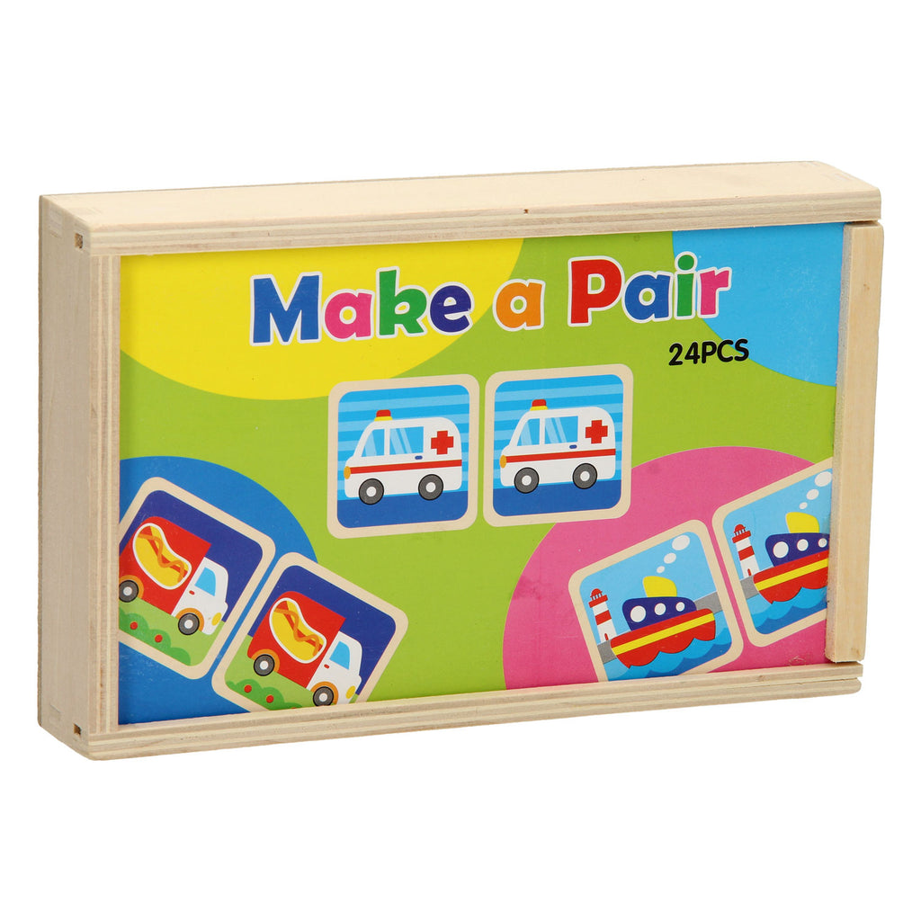 Zoek de brandweerwagens, boten en ambulances bij elkaar in het Houten Memo Voertuigen. Dit memo spel bestaat uit 24 houten plaatjes en een houten kistje.