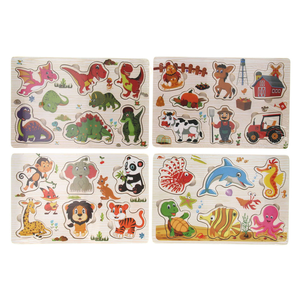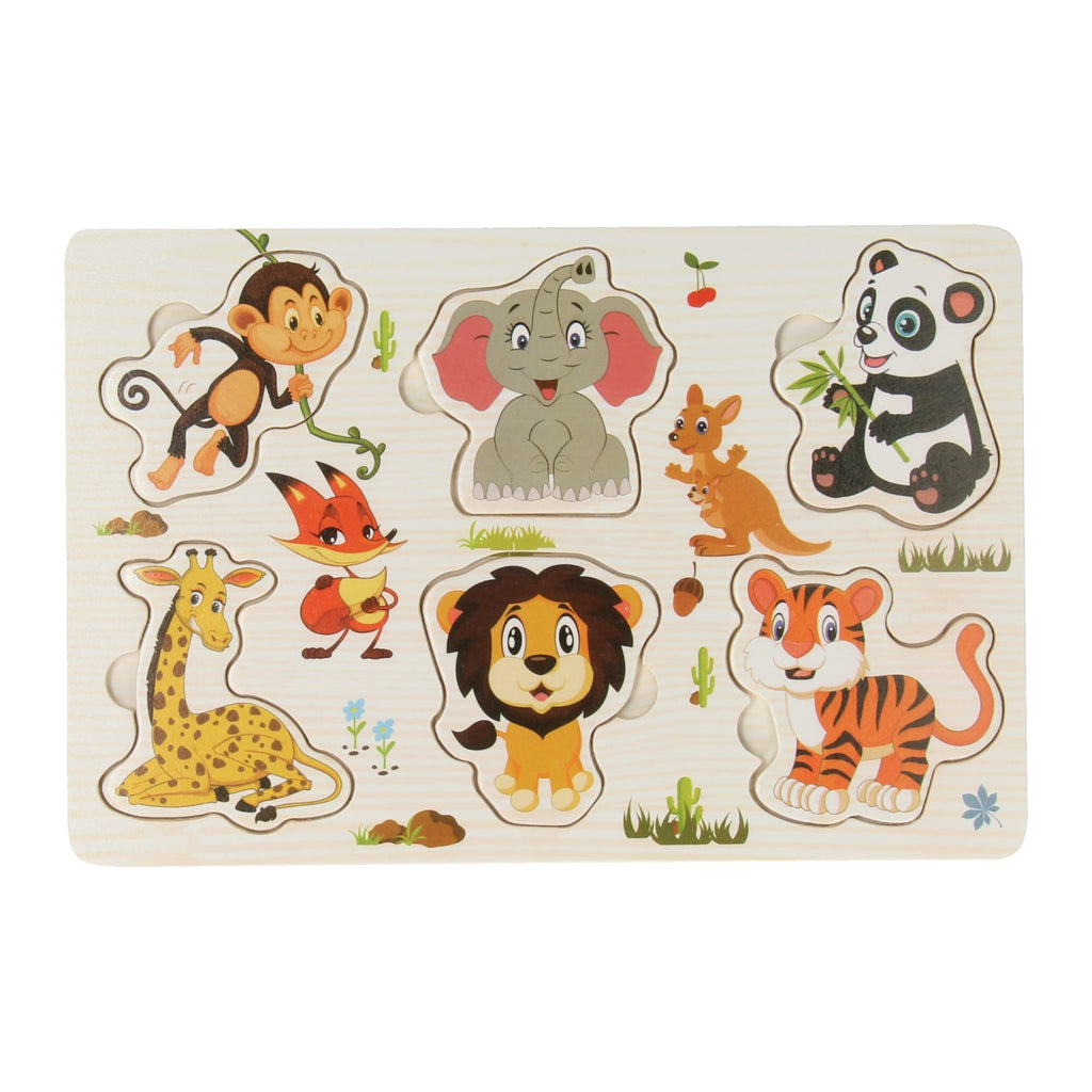Houten noppenpuzzel met 6 puzzelstukken om in te leggen. Afmetingen: 15 x 22,5 centimeter. Gemaakt van 100% FSC-gecertificeerd hout. Geschikt voor kinderen vanaf 24 maanden oud.
