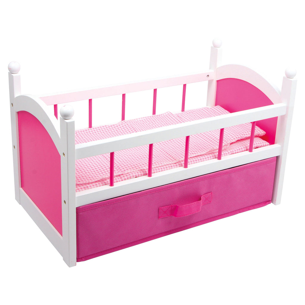 Een mooi houten poppenbed met opberglade. Inclusief roze kussen, matras, dekbed en handige opberglade.