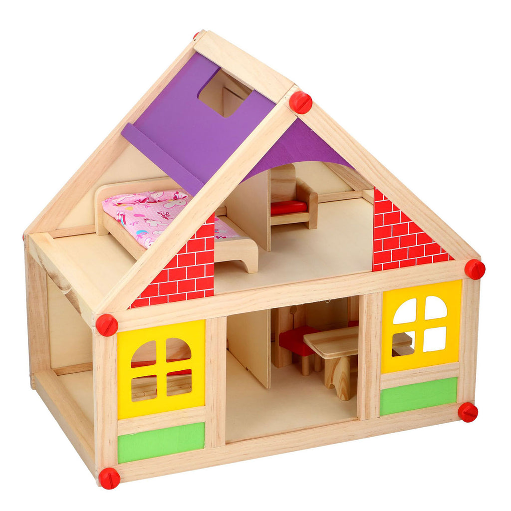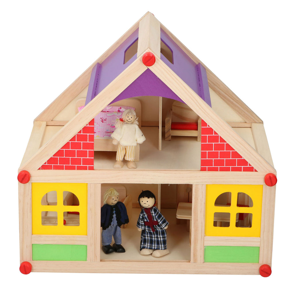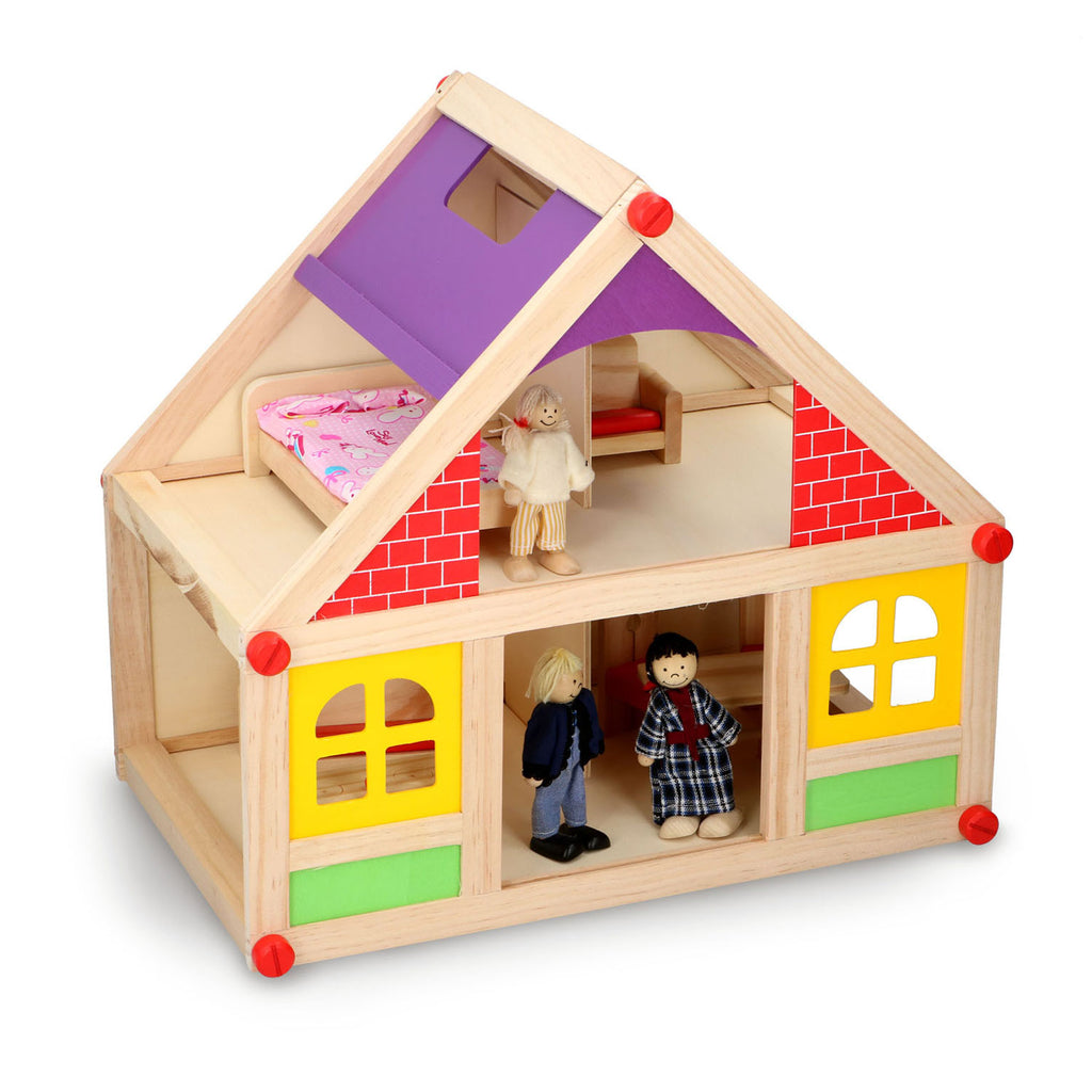 Houten Poppenhuis, 11dlg. Bij het poppenhuis zitten verschillende accessoires: drie poppetjes (vader, moeder, kind), twee stoelen, een tafel, een bed, een kast, een fauteuil en een bank. Zet het poppenhuis in elkaar en richt het naar eigen wens in. Met de duidelijke handleiding heb je het zo in elkaar gezet.