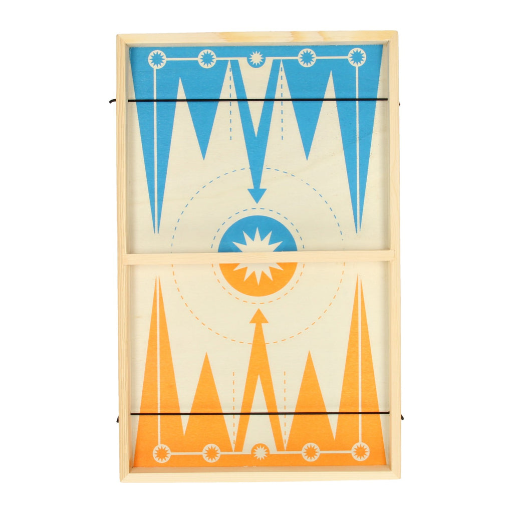 Houten puckschietspel voor 2 spelers. Gebruik de elastieken om alle pucks aan de overkant te krijgen. Inclusief 10 houten pucks, geschikt vanaf 3 jaar. Afmetignen: 35 x 22 cm.