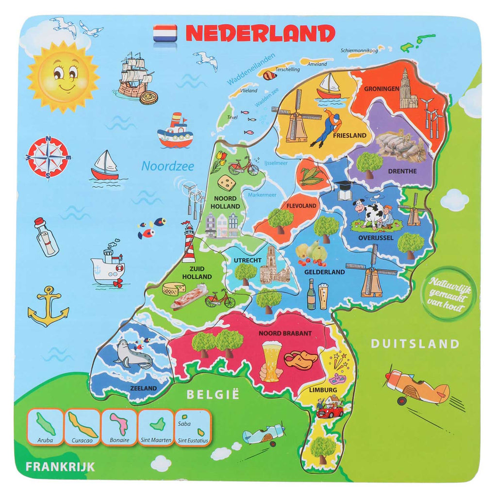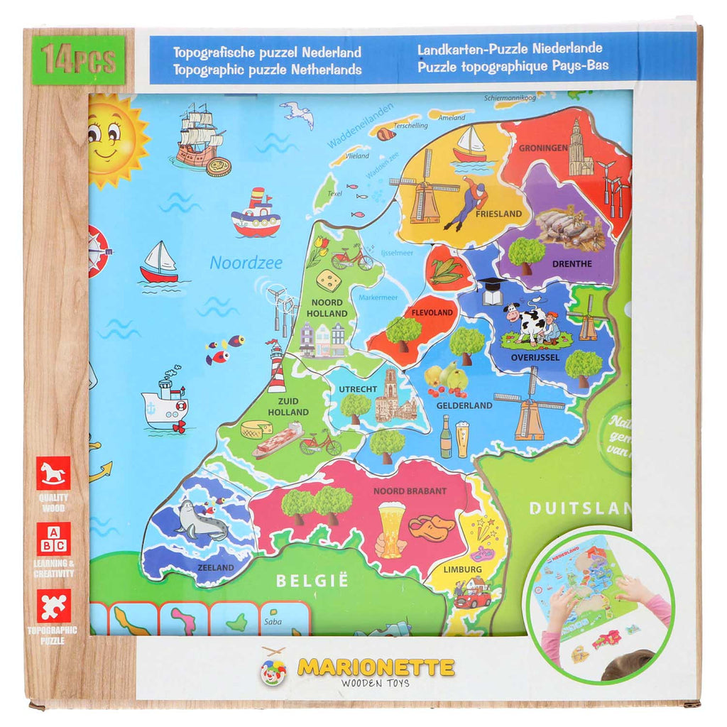 Topografische houten puzzel van de kaart van Nederland. De puzzel bestaat uit 13 stukken en is 30 x 30 centimeter groot. Geschikt vanaf 3 jaar.