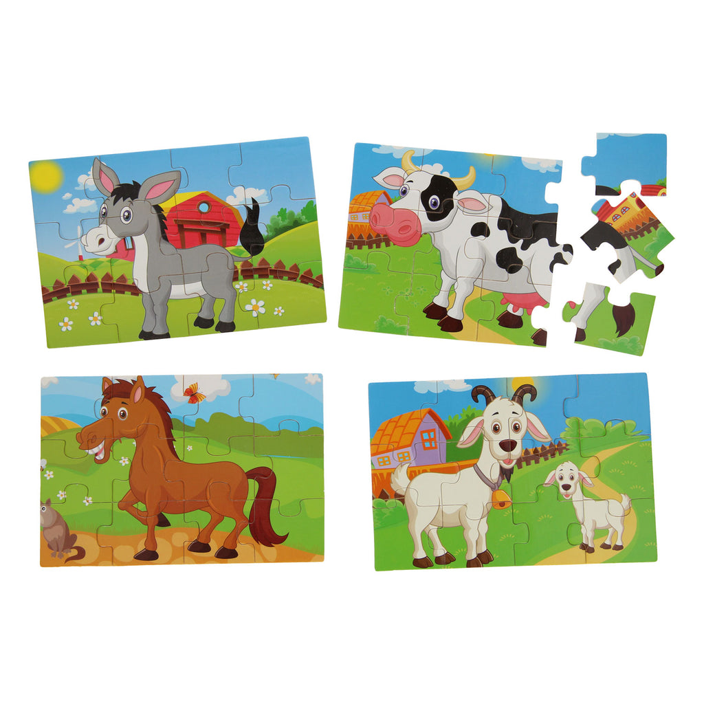 De Houten Puzzelbox 4in1 - Boerderij is gevuld met 4 legpuzzels van 12 stukjes: een paard, koe, ezel en geiten.