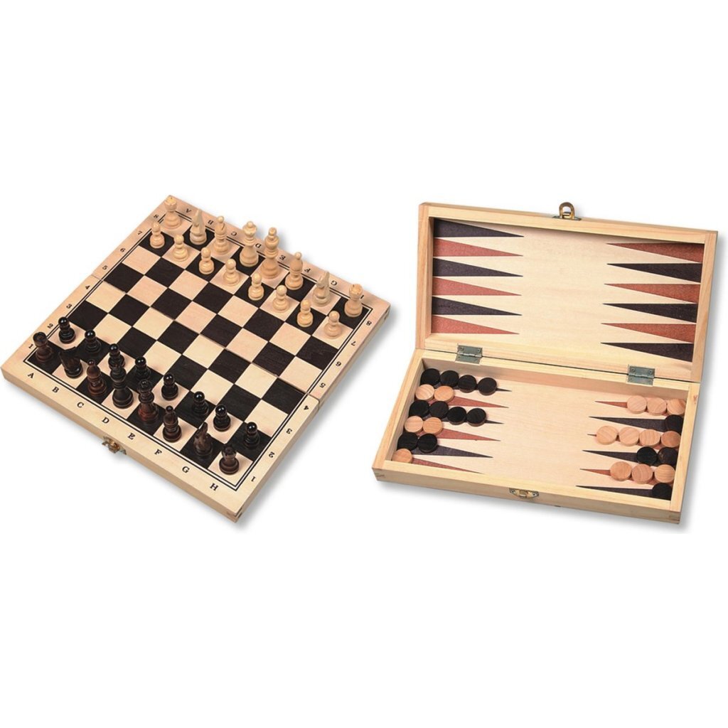 Houten cassette met schaakveld op één kant en backgammon veld op de andere kant, inclusief speelstenen voor beide spellen. Geschikt voor kinderen vanaf 4 jaar.