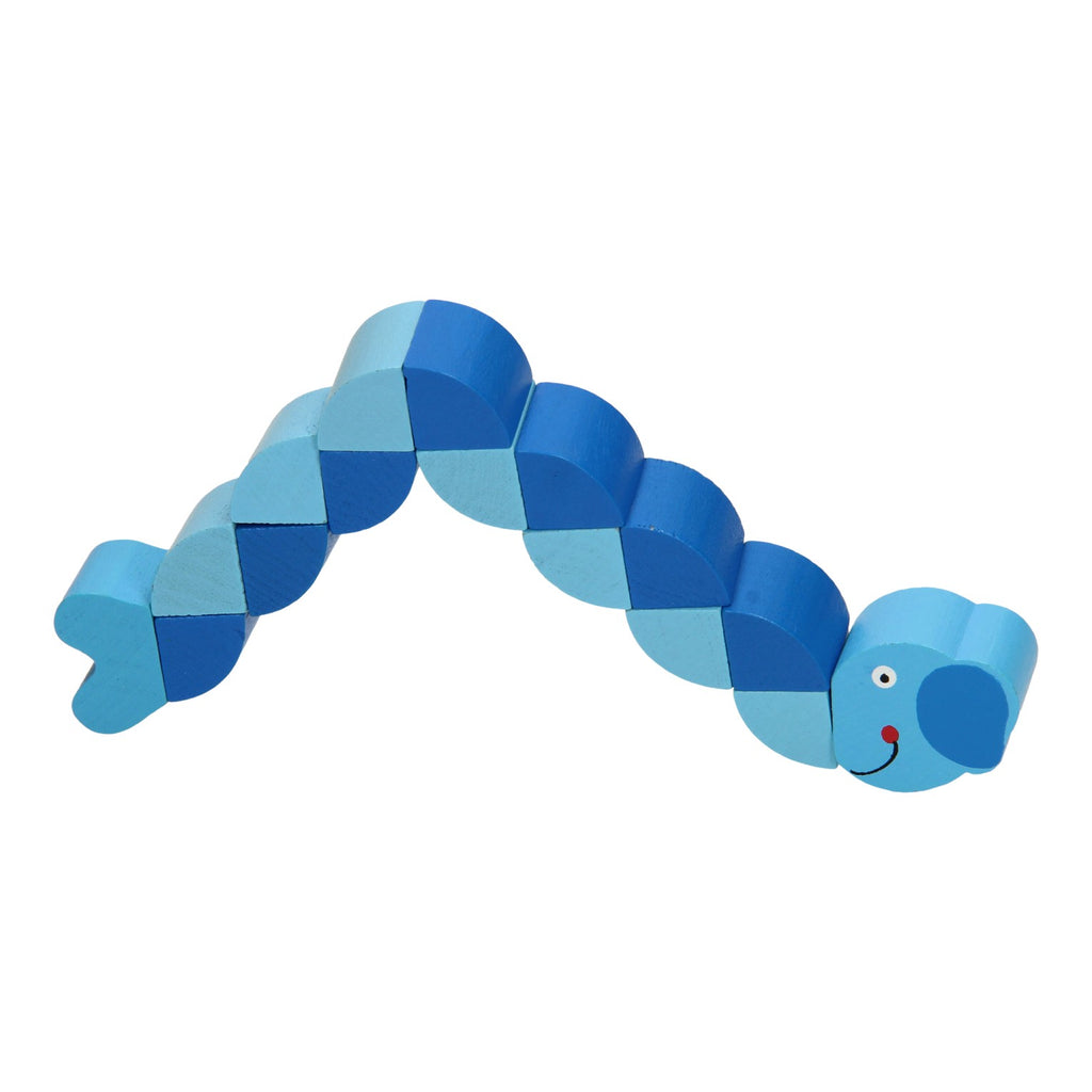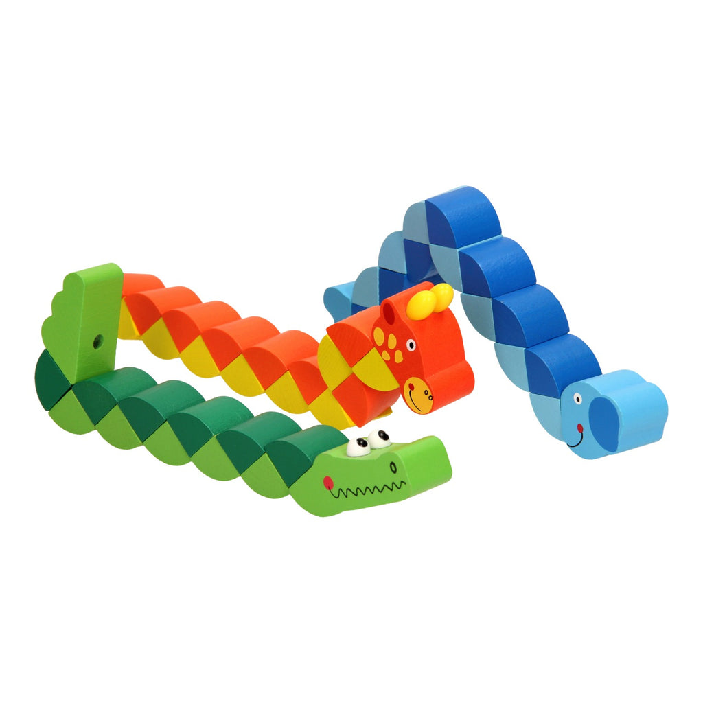 Bedenk en maak zelf de raarste kronkels met dit Houten Schakeldier! Tussen de blokjes in zit stevig elastiek. Trek elke keer een blokje een andere kant op en kijk of het lukt om de vormen te maken die jij wilt! Geschikt vanaf 10 maanden.