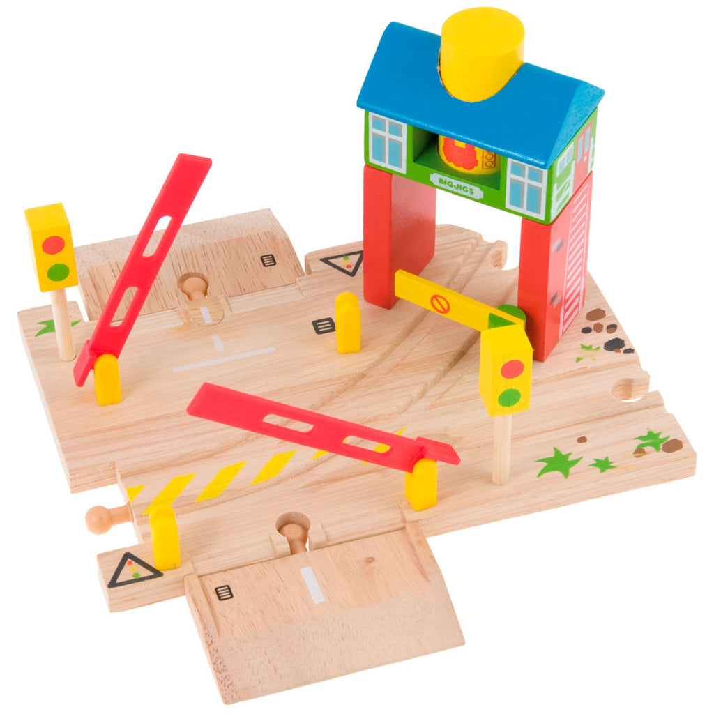 Houten seinhuis, geschikt om te combineren met de rails en wegdelen van BigJigs. Met drie aansluitingen voor het spoor en twee voor de weg.