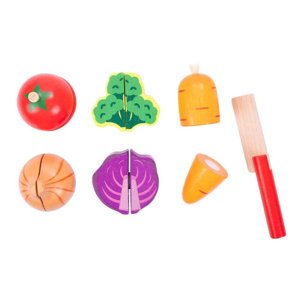 Wordt een echte kok met deze houten snijset! Deze set bestaat uit een snijplankje, een mesje, een wortel, een tomaat, een broccoli, een uit en een rode kool. In de groenten zit klittenband, zodat het uit elkaar gesneden én aan elkaar gemaakt kan worden.
