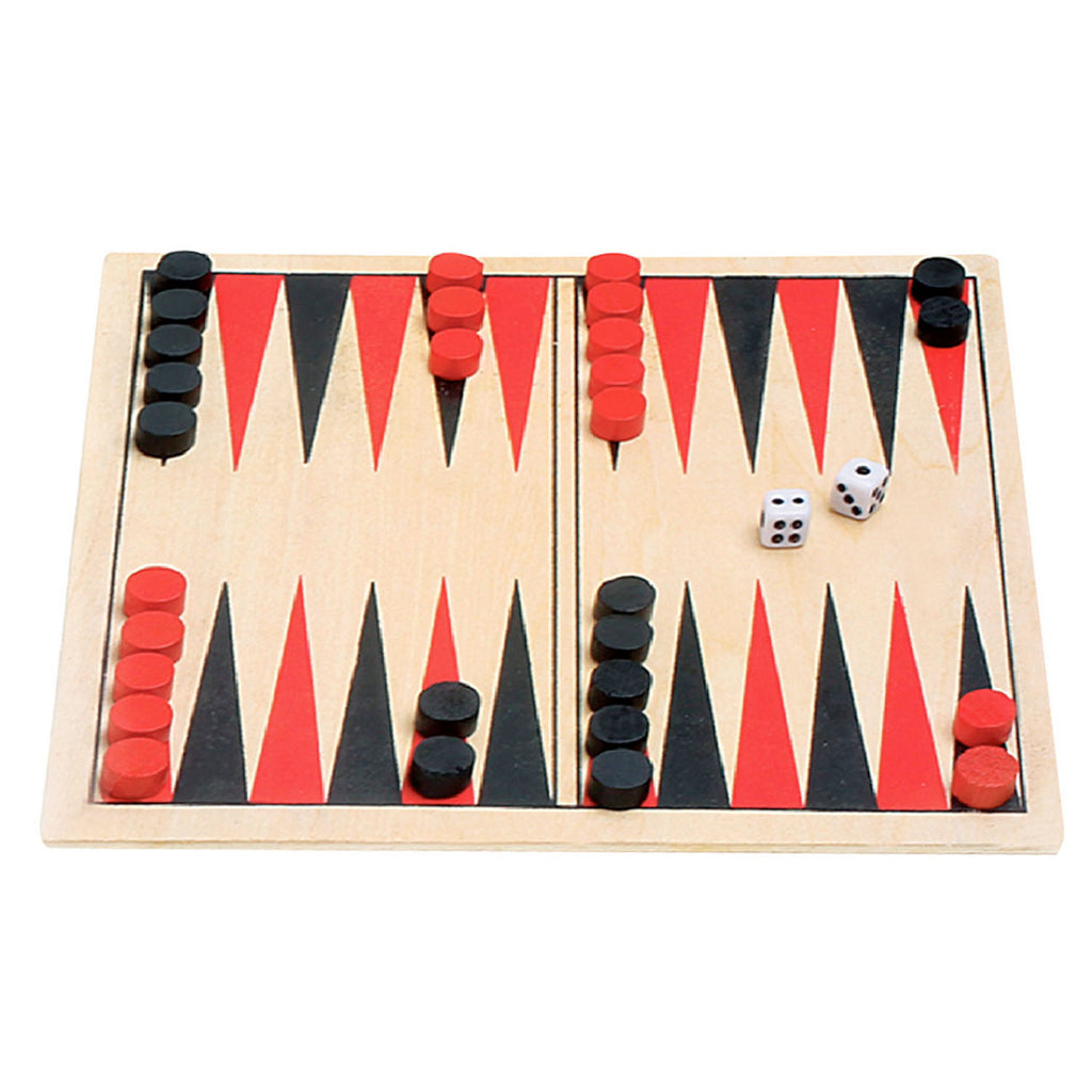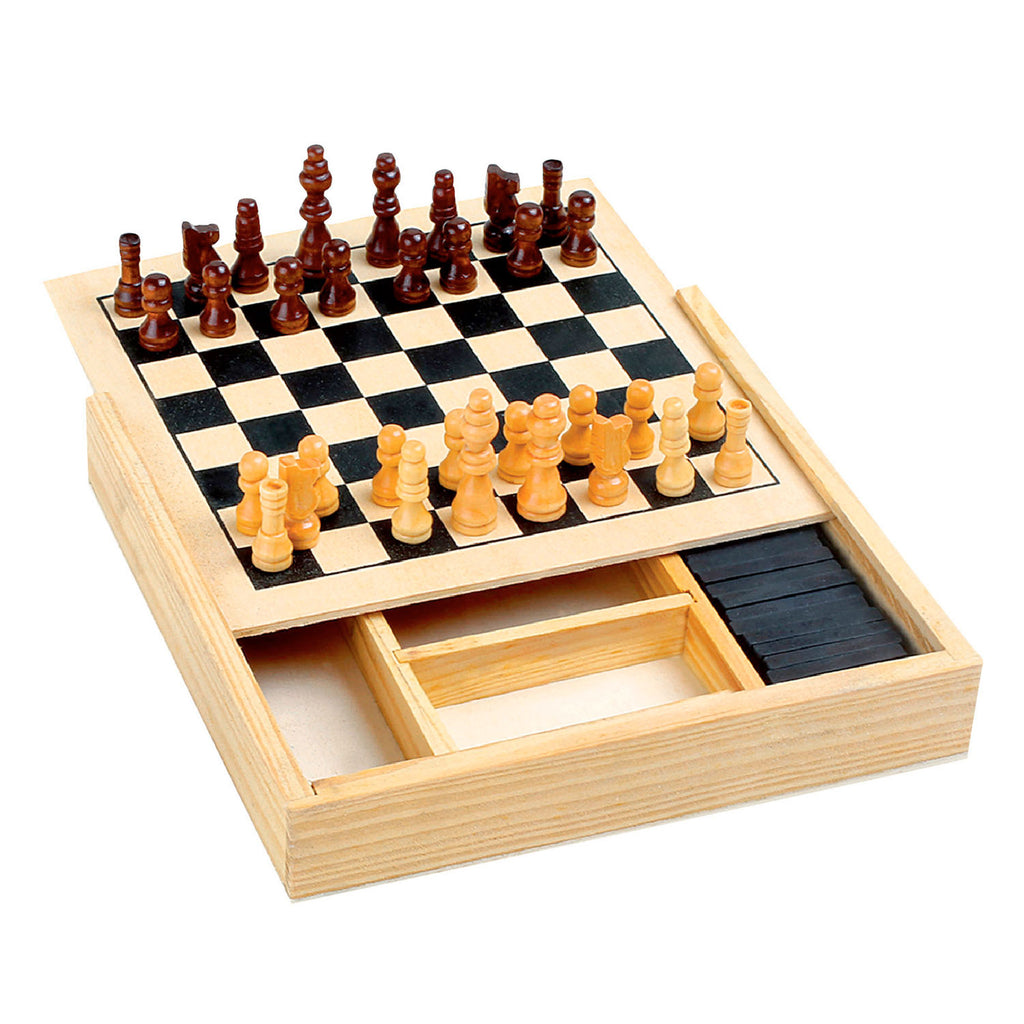 Deze houten spellendoos bevat vier vertrouwde spellen: backgammon, mikado, schaken en domino. Door het compacte formaat ideaal om mee te nemen op vakantie.