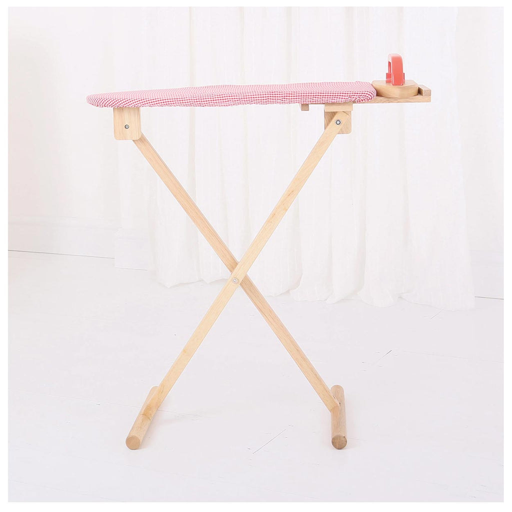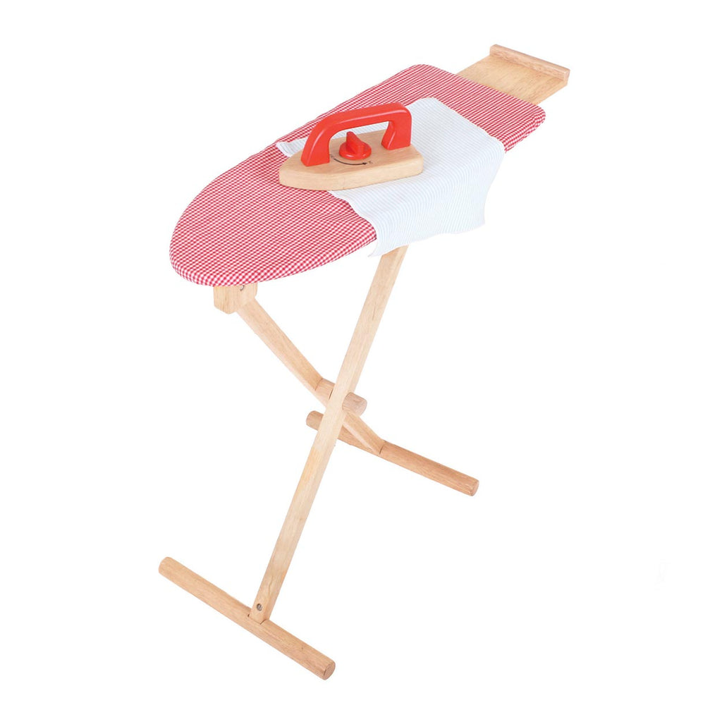Houten strijkplank met strijkplankhoes en een bijpassend strijkijzer met temperatuurregelaar. De strijkplank is inklapbaar.