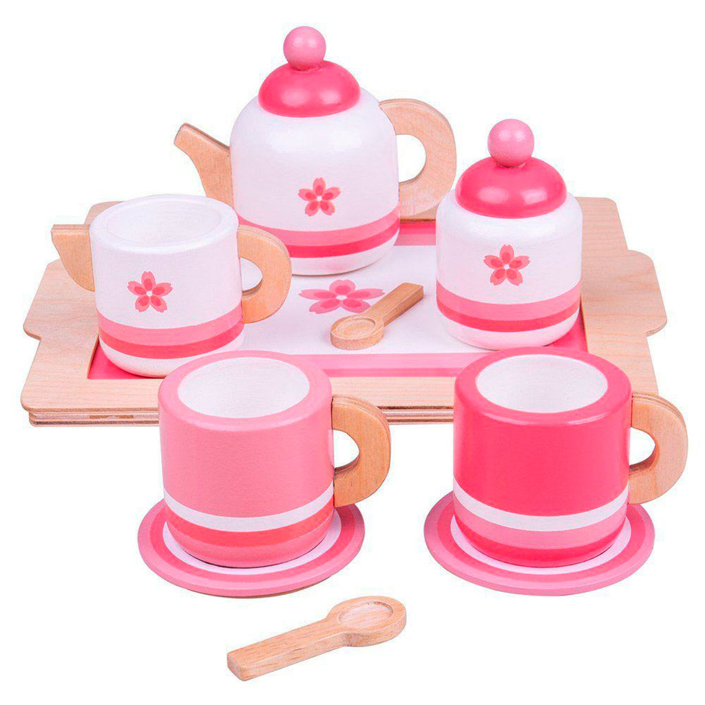 Gezellig thee drinken met je vriendin of pop! Dat doe je met het roze Houten Theeservies. Deze bestaat uit een dienblad, theepot, 2 kopjes, 2 lepeltjes, suikerpot en melkkannetje. Het roze Houten Theeservies is voorzien van een vrolijk strepenmotief en bloemetjes.