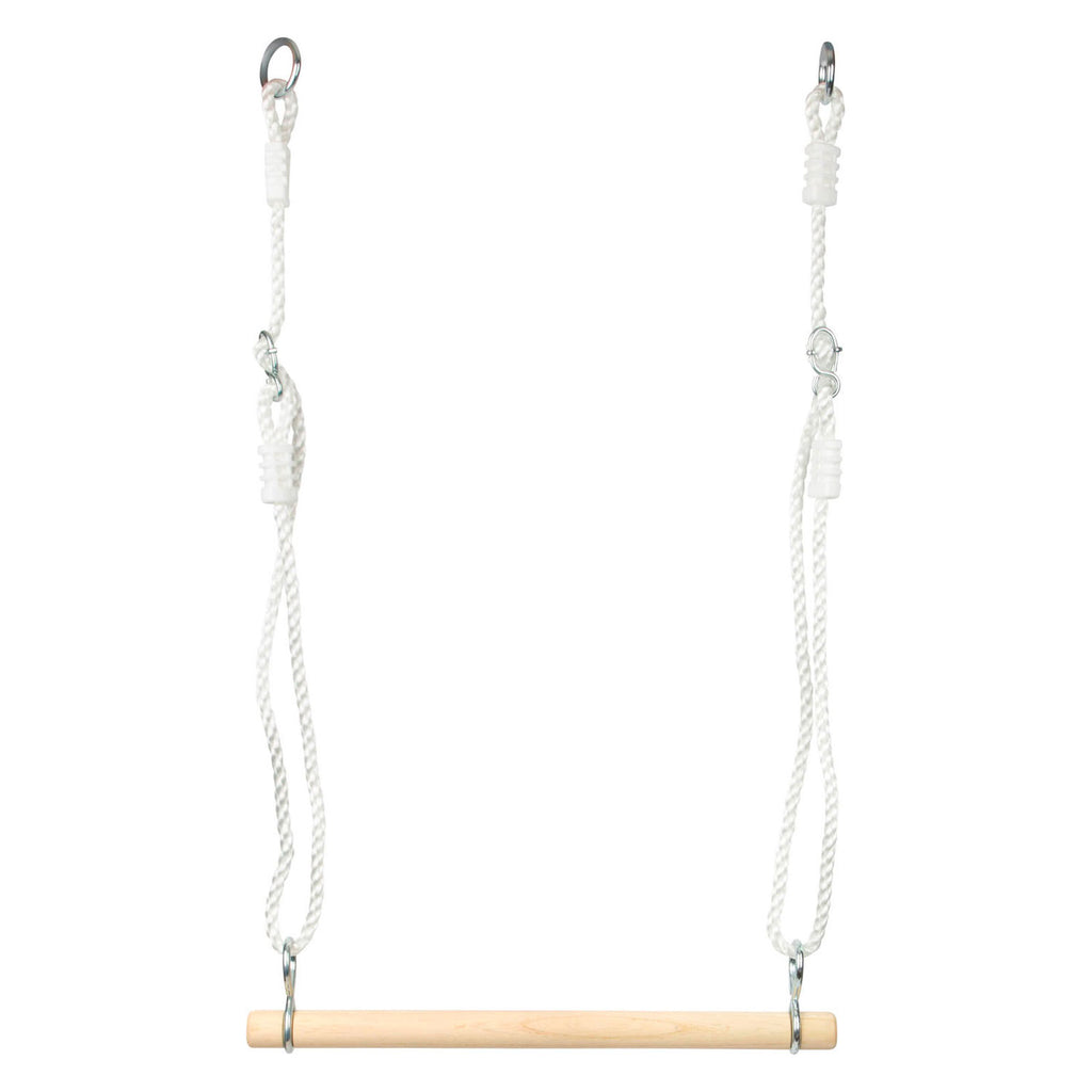Is het een hoge lat of een schommel? Het is beide! Op deze houten trapeze kunnen jonge acrobaten naar hartelust zitten of hangen. Kleine circusartiesten kunnen dankzij deze trapeze oefenen voor eerste grote show! De trapeze wordt geleverd met stevige, in lengte verstelbare touwen en metalen ringen. De trapeze is 80 centimeter hoog en 48 centimeter breed. De balk heeft een doorsnede van 3 centimeter. Het maximale gewicht is 100 kg.