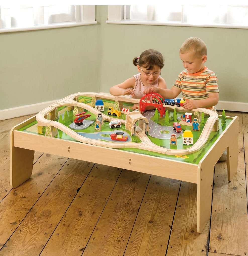 Beleef eindeloos speelplezier met deze speeltafel met treinbaan van hout. Bestaat uit 59 delen. Afmeting: 102,5 bij 32 bij 73 centimeter. Geschikt voor kinderen van 3 tot 6 jaar oud.