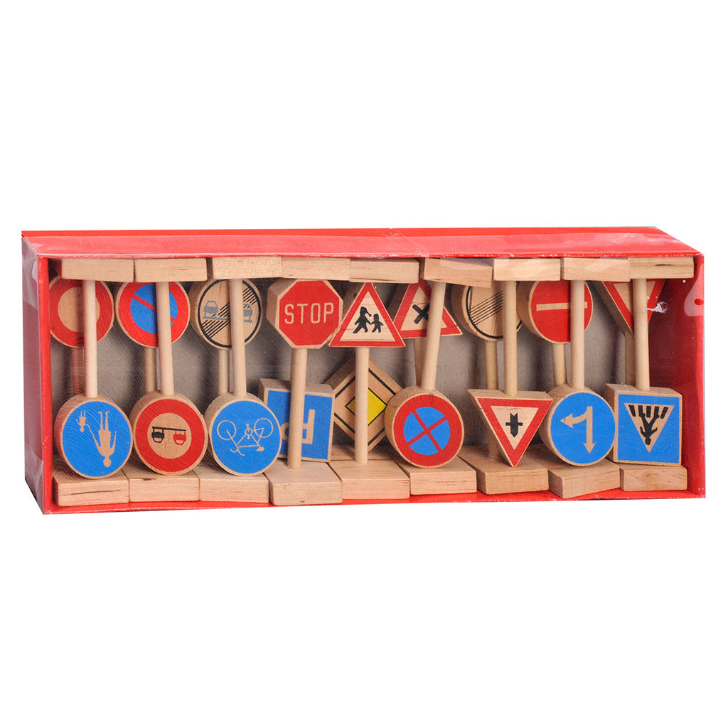 Set van 18 houten verkeersborden. Met onder andere een stopbord, verplicht fietspad, niet parkeren, zebrapad, voetgangerspad en een voorrangsweg.