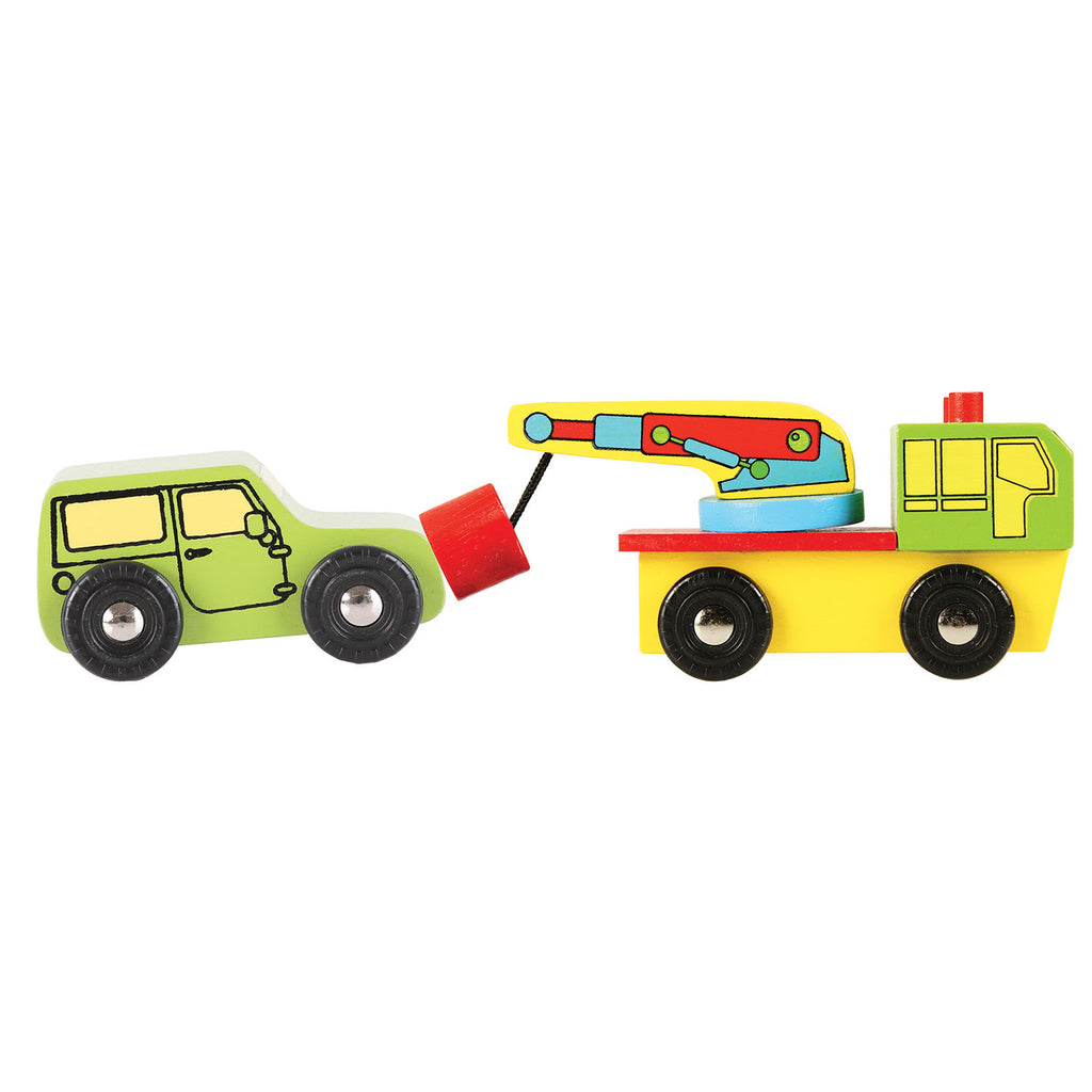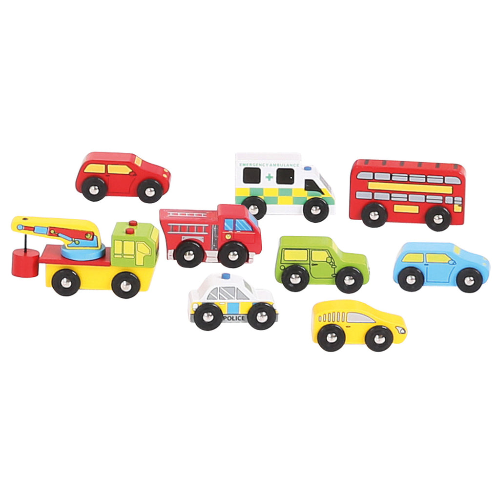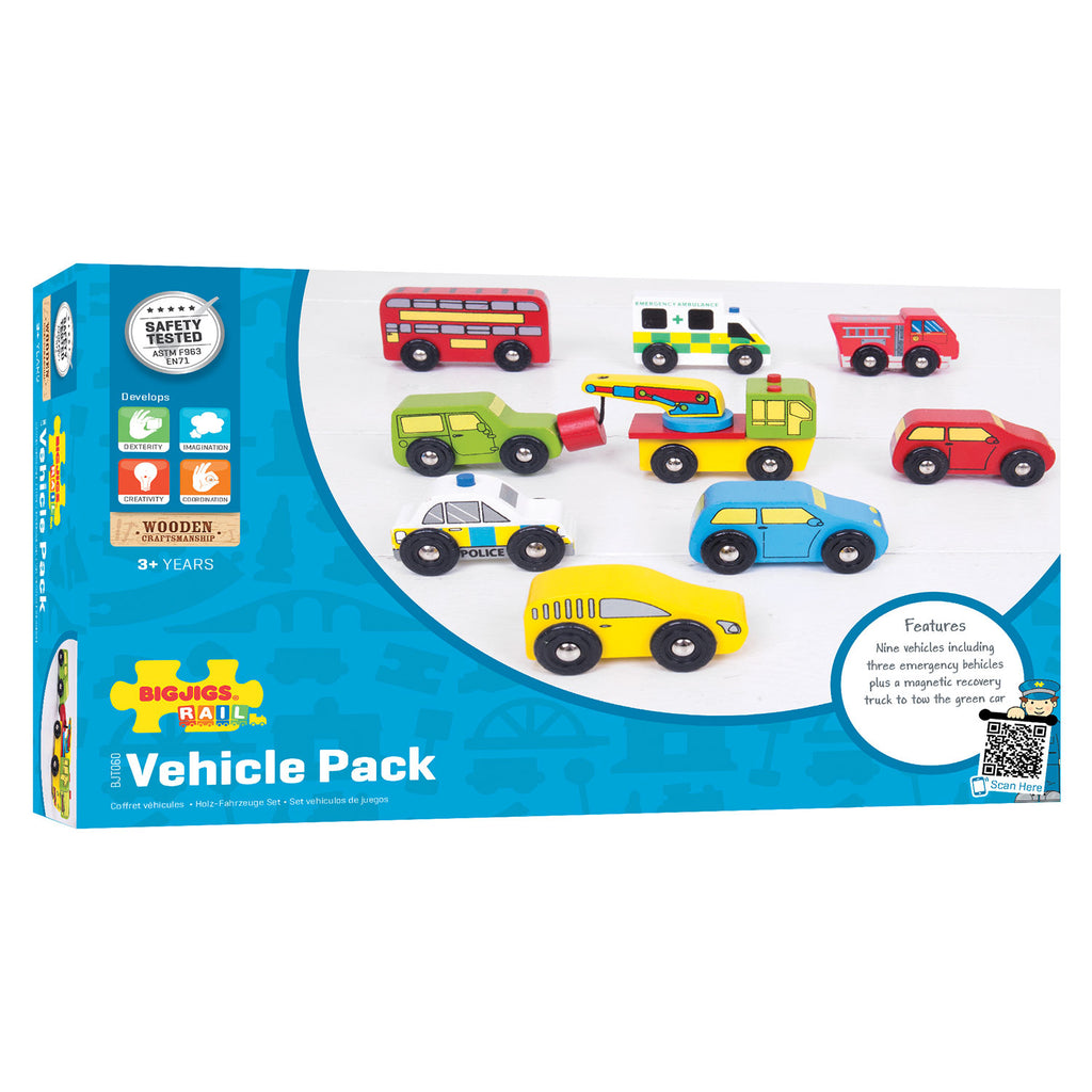 Met deze 9 houten voertuigen beleef je de leukste avonturen! Je hebt 9 verschillende soorten auto's. Je hebt een brandweerwagen, politieauto, ambulance, bus, een takelwagen en 4 personen auto's. Met deze complete set kun je uren variëren in je spel. De takelwagen kan met de magneet ook echt de groene auto slepen. Past bij de bekende Bigjigs wegen.
